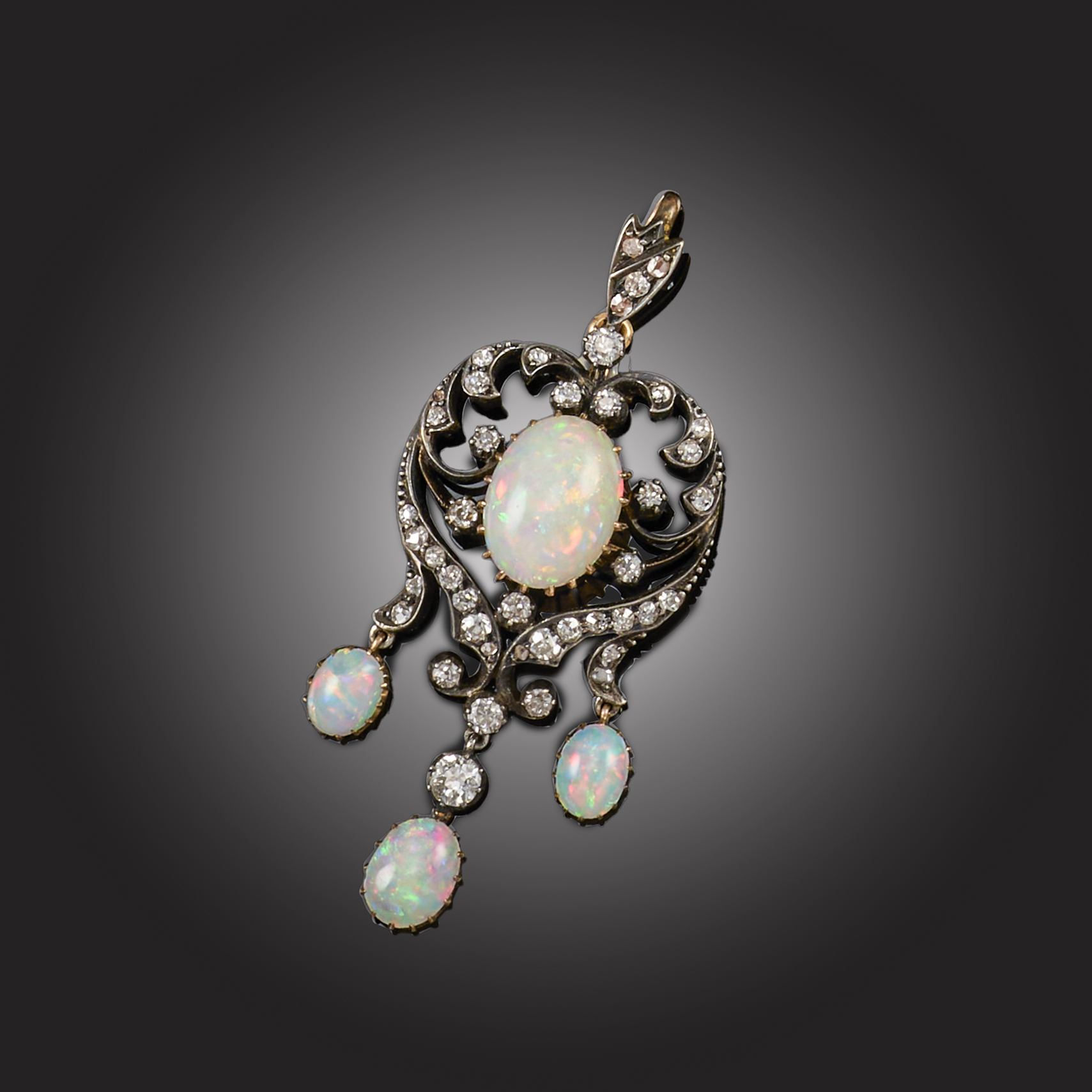 A LATE VICTORIAN OPAL AND DIAMOND PENDANT, centred with an oval cabochon opal within an openwork scrolling surround set with old circular-cut diamonds, suspending three graduated oval cabochon opal drops, mounted in silver and gold, removable diamond-set bail, length 5cm