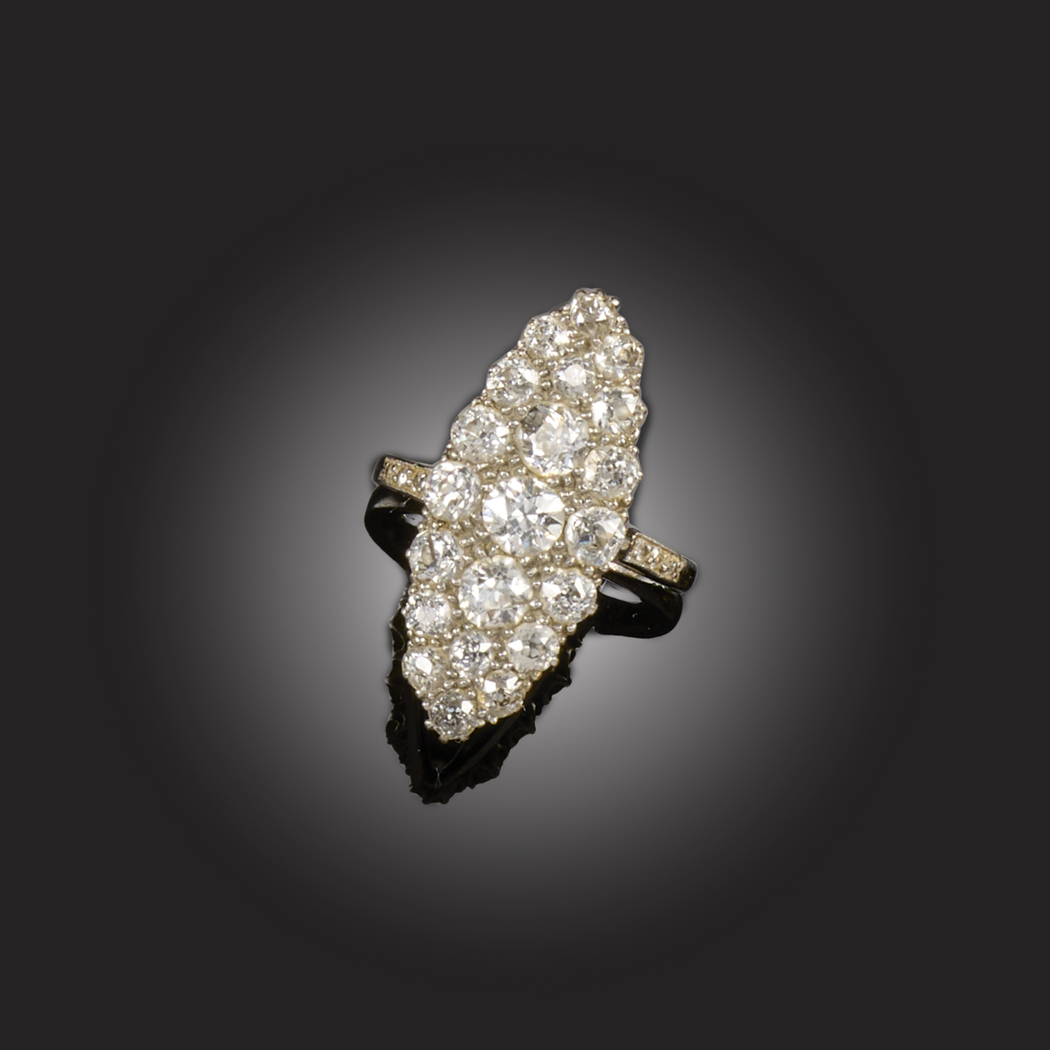 A DIAMOND CLUSTER RING, of navette-shaped design pavé-set with old circular-cut diamonds, mounted in platinum and white gold, stamped Pt & 18ct, size N
