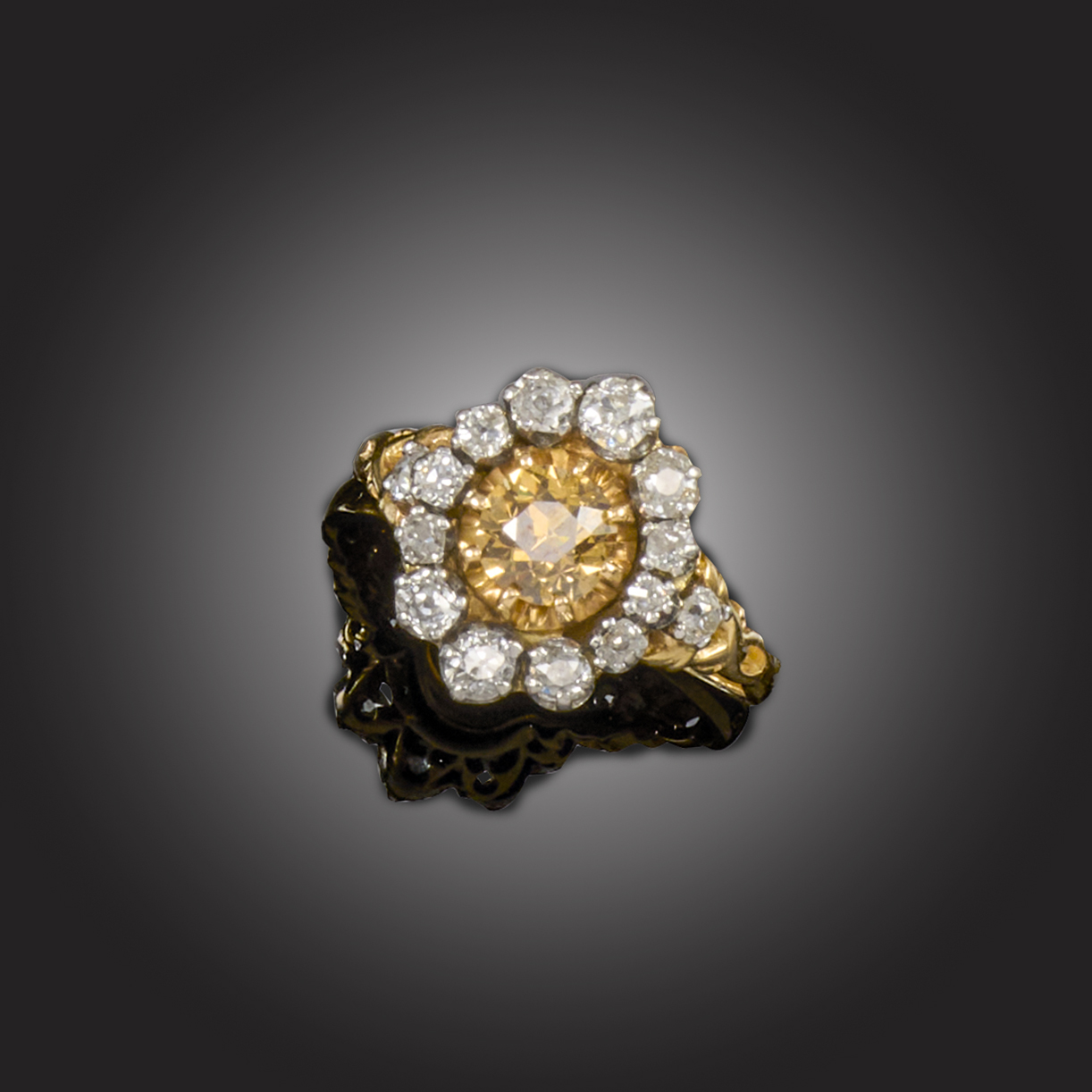 A FRENCH BROWN AND WHITE DIAMOND CLUSTER RING, centring on a round brilliant-cut brown diamond in an illusion setting, within a border of graduated old circular-cut diamonds, to bifurcated diamond-set shoulders in platinum and yellow gold, French control marks, size T