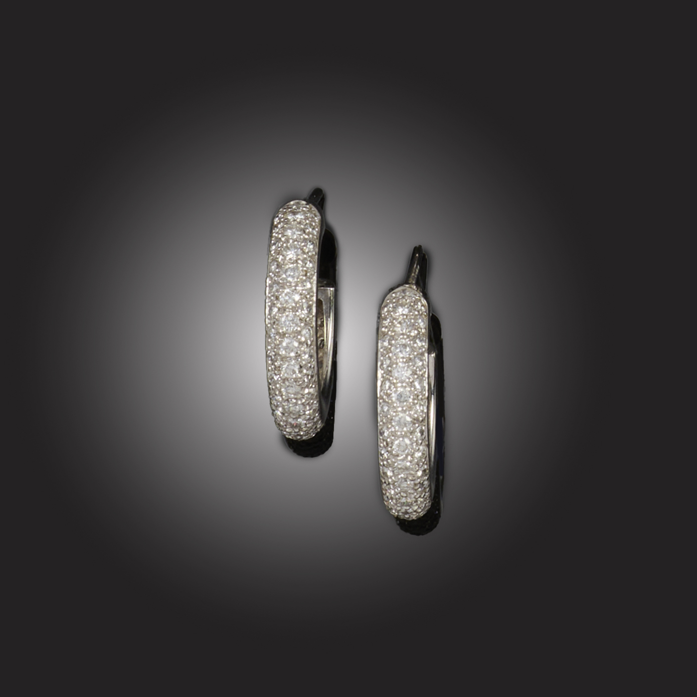 A PAIR OF DIAMOND AND 18CT GOLD EARRINGS, of hoop design, pavé-set with round brilliant-cut diamonds, in 18ct white gold, total approximate diamond weight 2.00cts, London hallmarks, post fittings, diameter 1.8cm, gross weight 7g
