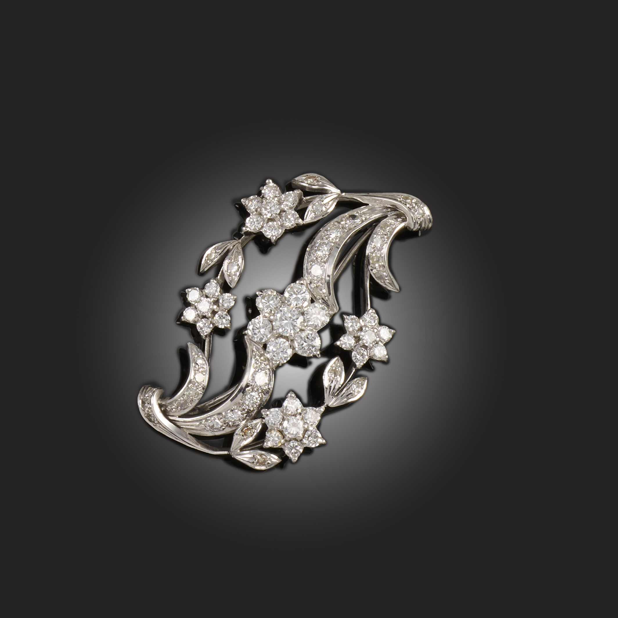 A DIAMOND FOLIATE BROOCH, set with graduated clusters of round brilliant-cut diamonds in white gold, length 5cm