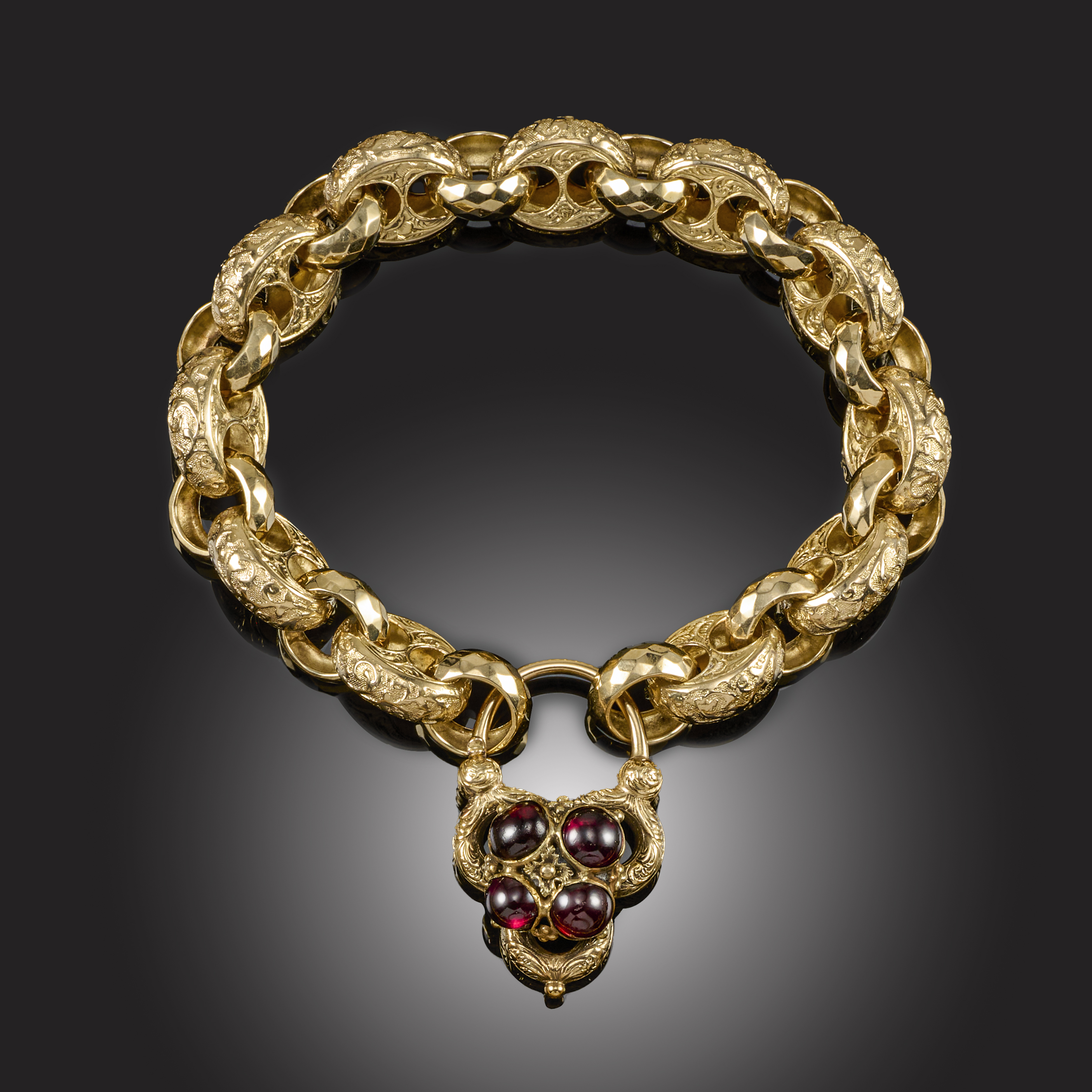 A VICTORIAN GARNET-SET BRACELET, MID-19TH CENTURY, of foliate engraved anchor-links alternately-set with textured circular links, with a garnet cabochon-set trefoil form clasp, in yellow gold, bracelet inner circumference 16.5cm, clasp length 3.5cm