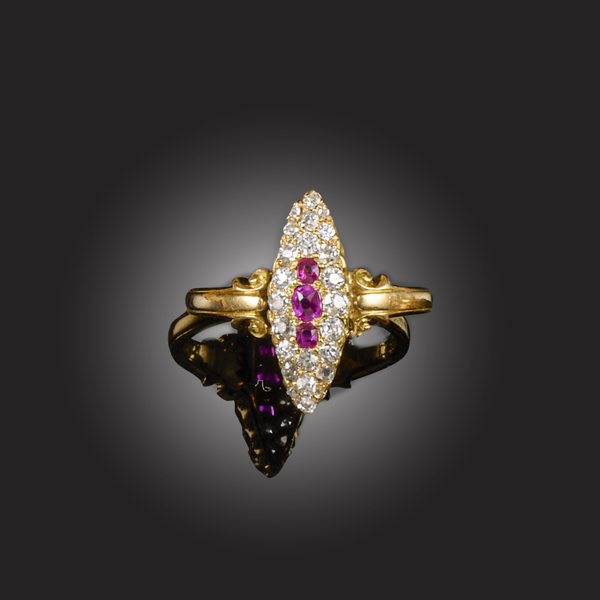 AN EARLY 20TH CENTURY RUBY AND DIAMOND RING, of lozenge design, set with three graduated old oval-shaped rubies within a surround of diamonds in 18ct yellow gold, Birmingham hallmarks, marks partially worn, size O