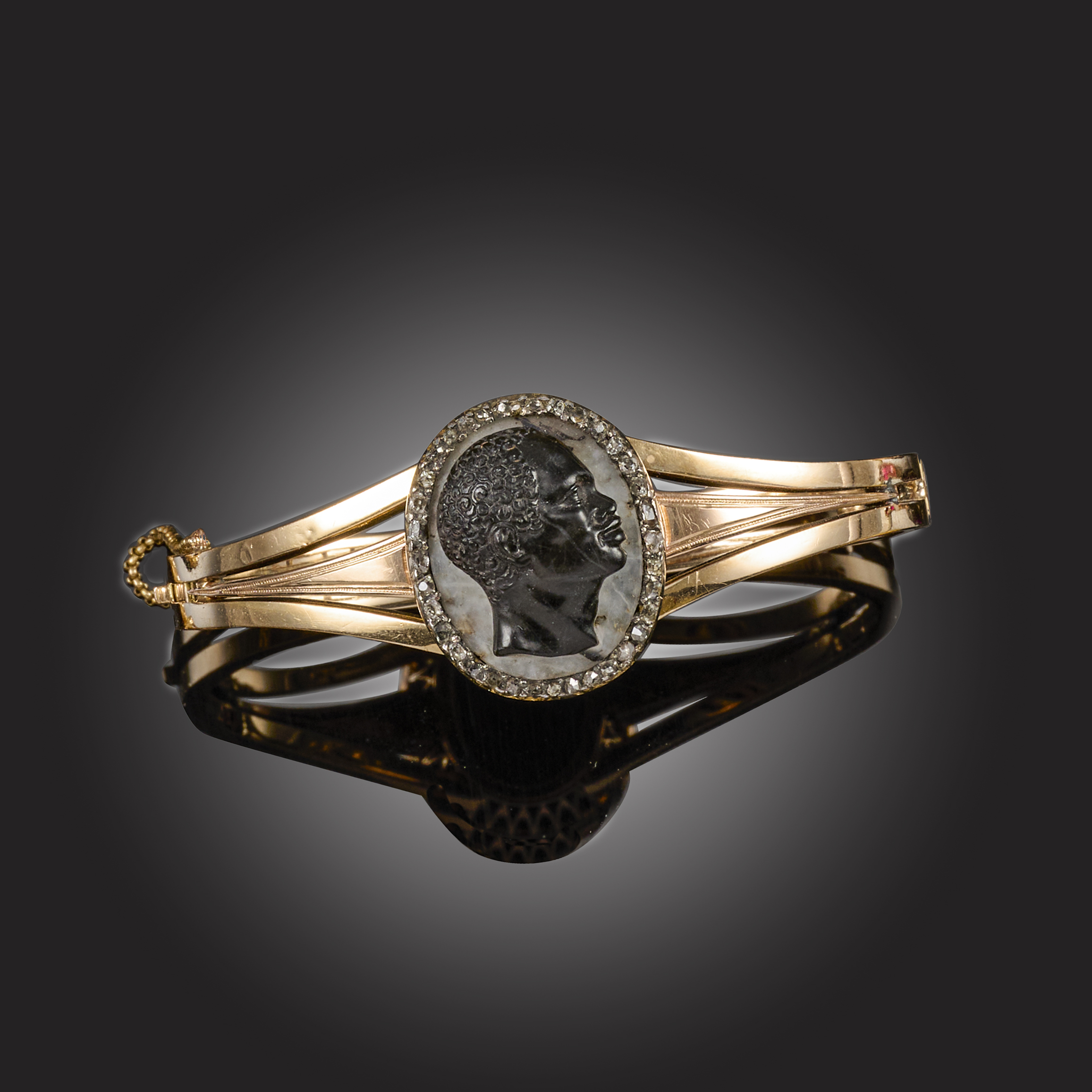 A VICTORIAN BANDED AGATE AND DIAMOND CAMEO BANGLE, of hinged design, set with a banded agate 'Blackamoor' cameo within a border of rose-cut diamonds, mounted in silver and gold, inner circumference 17.5cm, gross weight 25g
