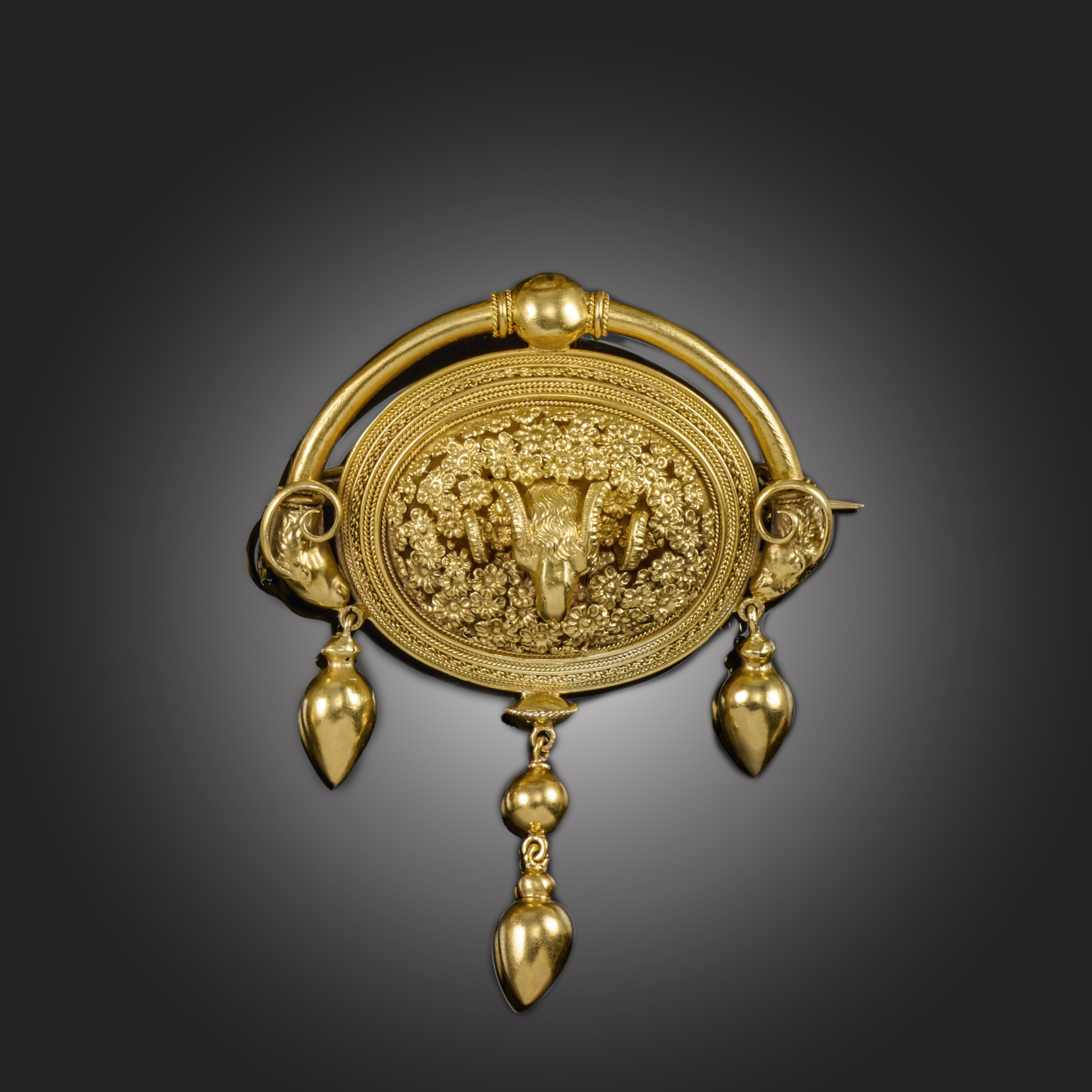 A CASTELLANI STYLE ARCHAEOLOGICAL-REVIVAL BROOCH, SECOND HALF 19TH CENTURY, depicting a Ram's head emerging from millefiori to the centre, within an oval concentric rope twist border, suspended from a torque frame terminating in Ram's heads, suspending three articulated amphora style drops, in yellow gold, width 5.2cm, cased