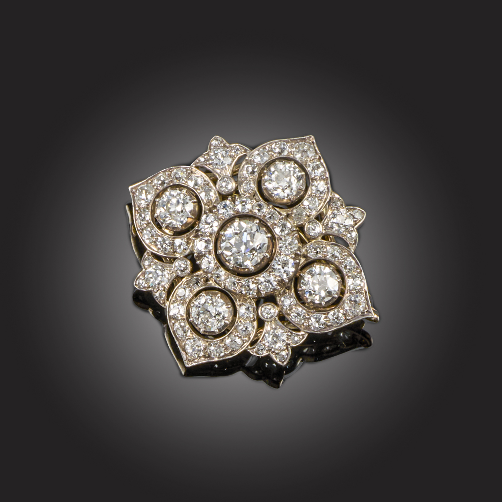 A VICTORIAN DIAMOND BROOCH, LATE 19TH CENTURY, of quatrefoil design, set with graduated old circular-cut diamonds in silver and gold, detachable brooch fitting, length 3.9cm
