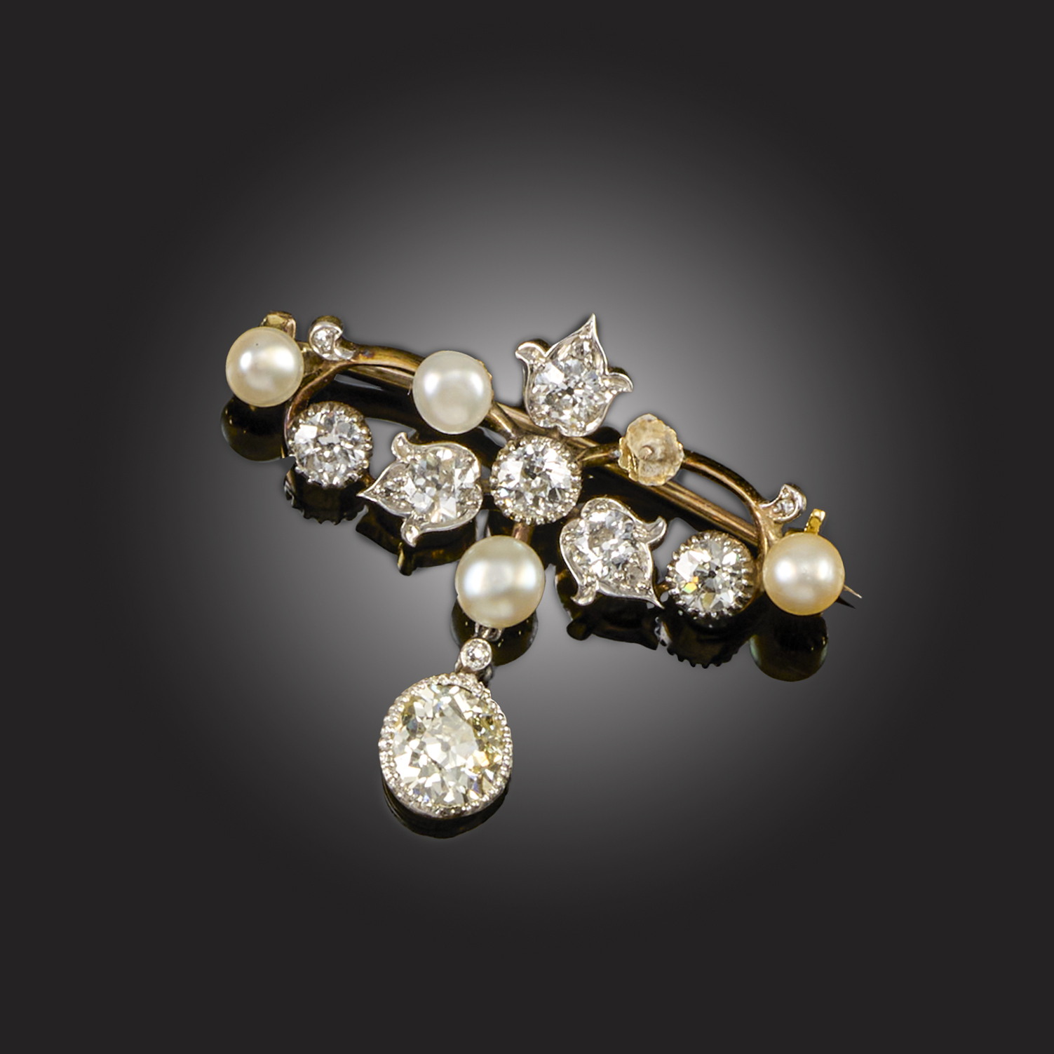AN EDWARDIAN PEARL AND DIAMOND FOLIATE BROOCH, set alternately with graduated cushion-shaped diamonds and pearls in foliate motif in platinum on gold wirework setting, suspending a cushion-shaped diamond, in platinum and gold, width 3.8cm, pearls untested, one pearl lacking