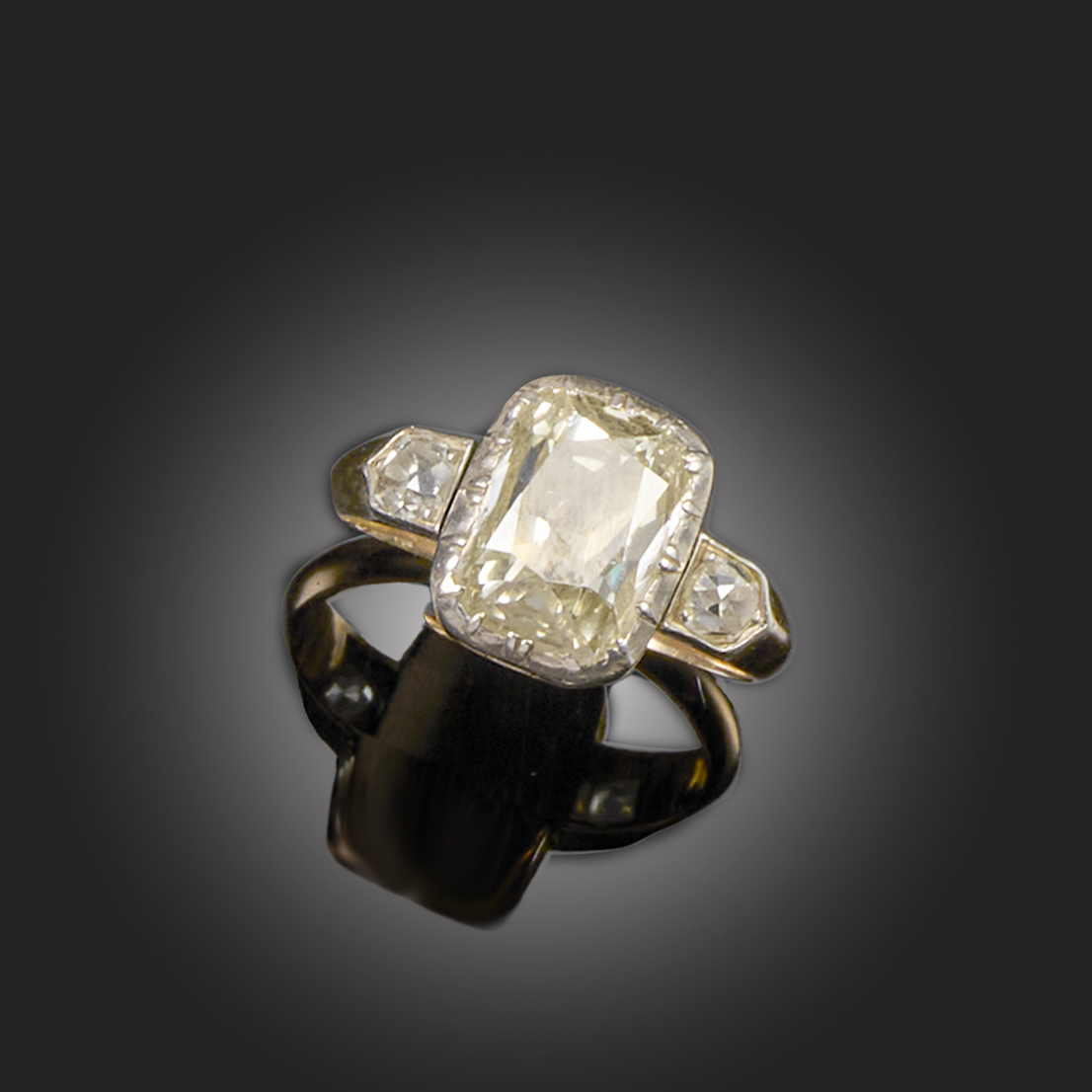 A LATE 19TH CENTURY DIAMOND LOCKET RING, the old cushion-shaped diamond in a collet setting weighing approximately 2.60cts, opening to reveal a locket compartment, between shoulders each set with a cushion-shaped diamond, mounted in silver and gold, size Q 1/2