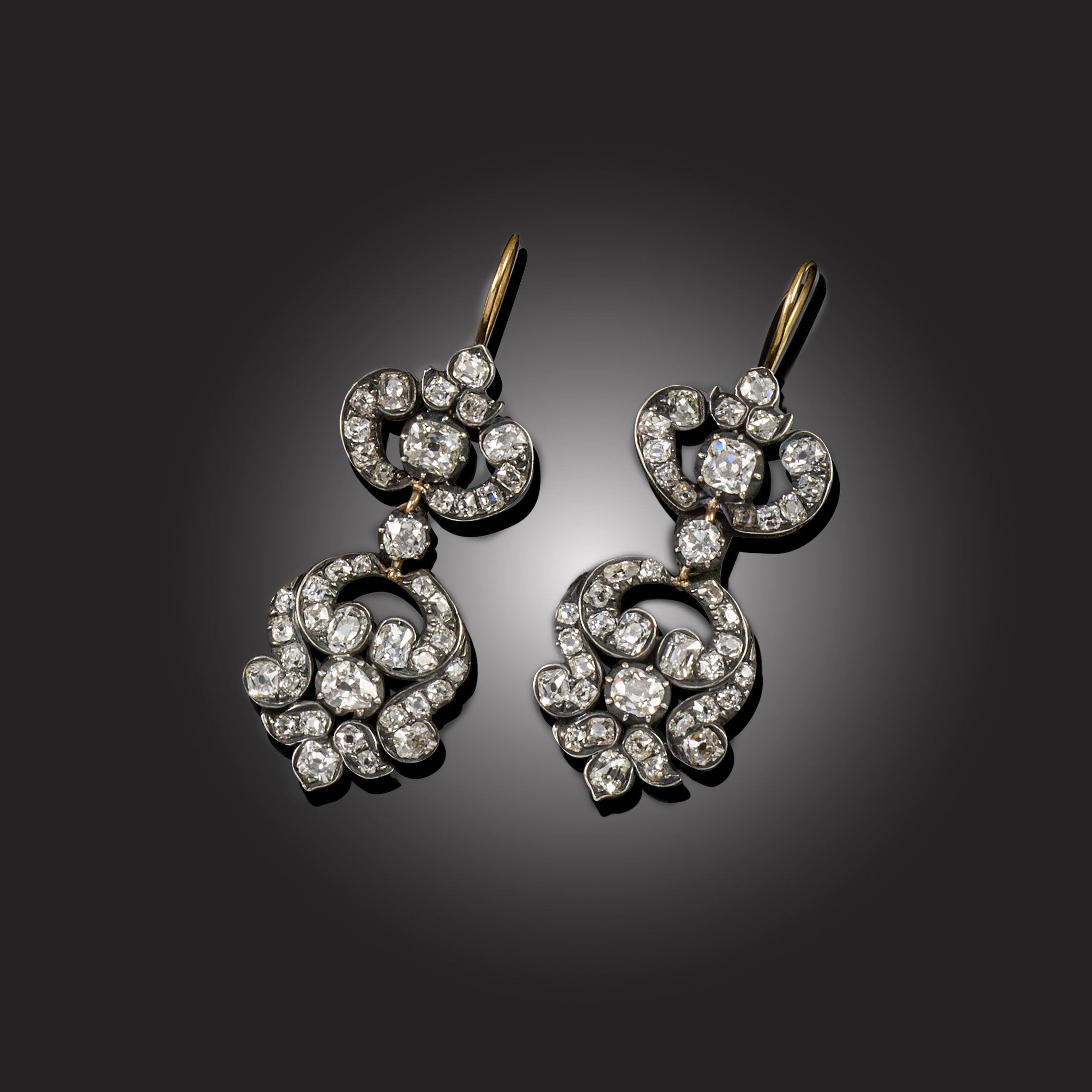 A PAIR OF DIAMOND DROP EARRINGS, each designed as two articulated scrolling links set with old cushion-shaped diamonds, spaced by a diamond-set link, mounted in silver and gold, hook fittings, length 5cm