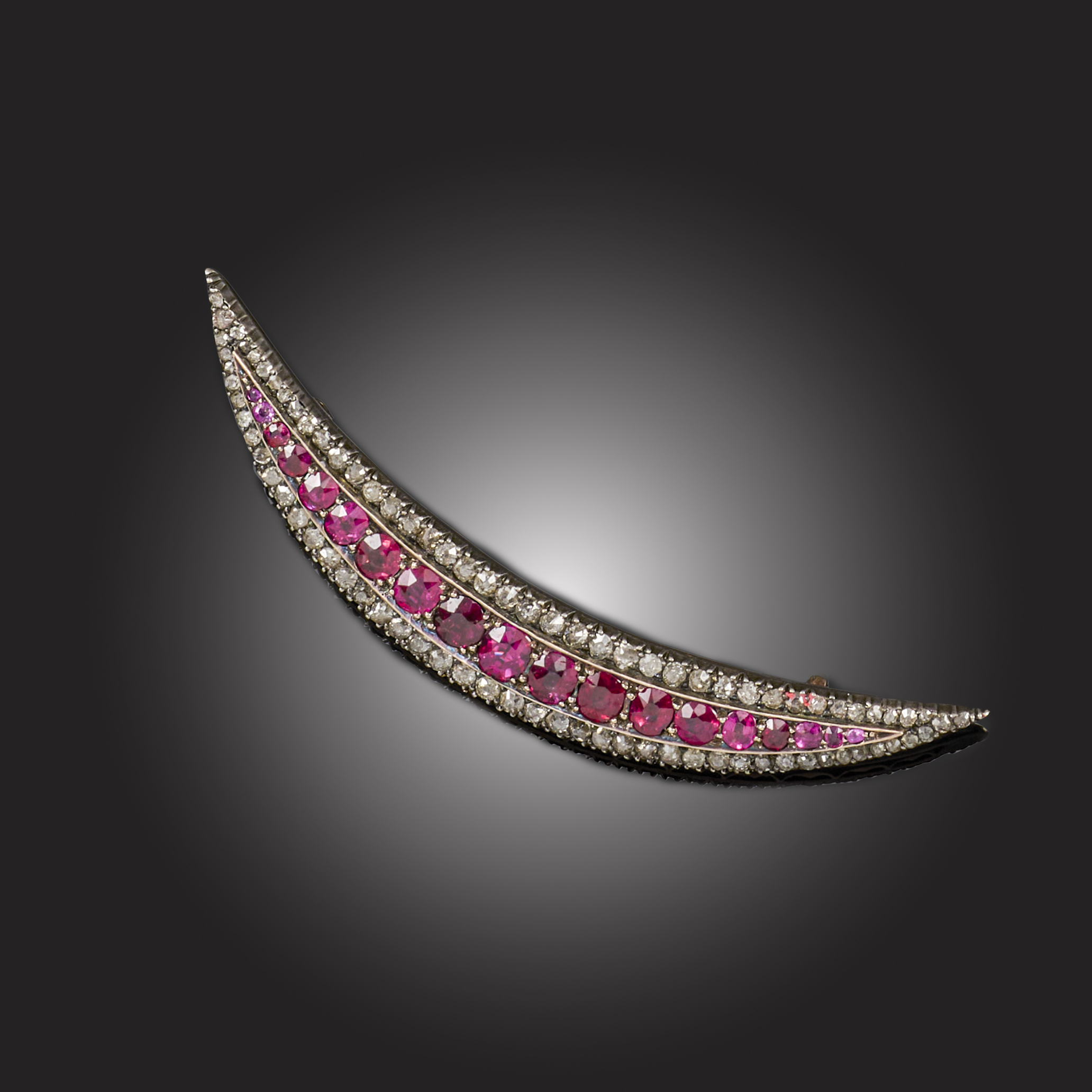 A VICTORIAN RUBY AND DIAMOND CRESCENT BROOCH