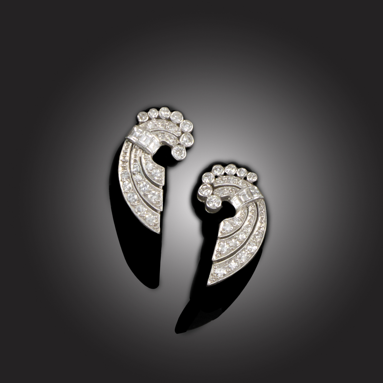 A PAIR OF ART DECO DIAMOND EAR STUDS, CONVERTED, of waisted scroll design, with circular-cut and baguette-shaped diamonds milligrain-set in platinum, post fittings, length 1.8cm