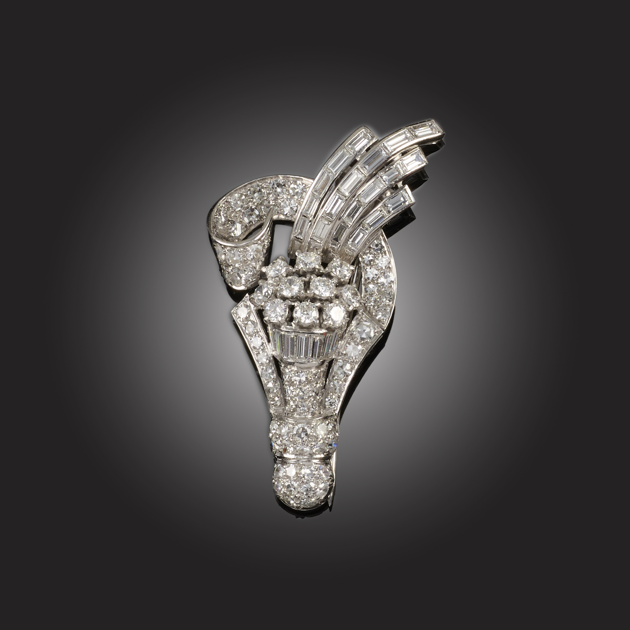 A DIAMOND SPRAY BROOCH, MID 20TH CENTURY, designed as a stylised cornucopia, set with circular-cut and baguette-cut diamonds, mounted in platinum, length 5.5cm
