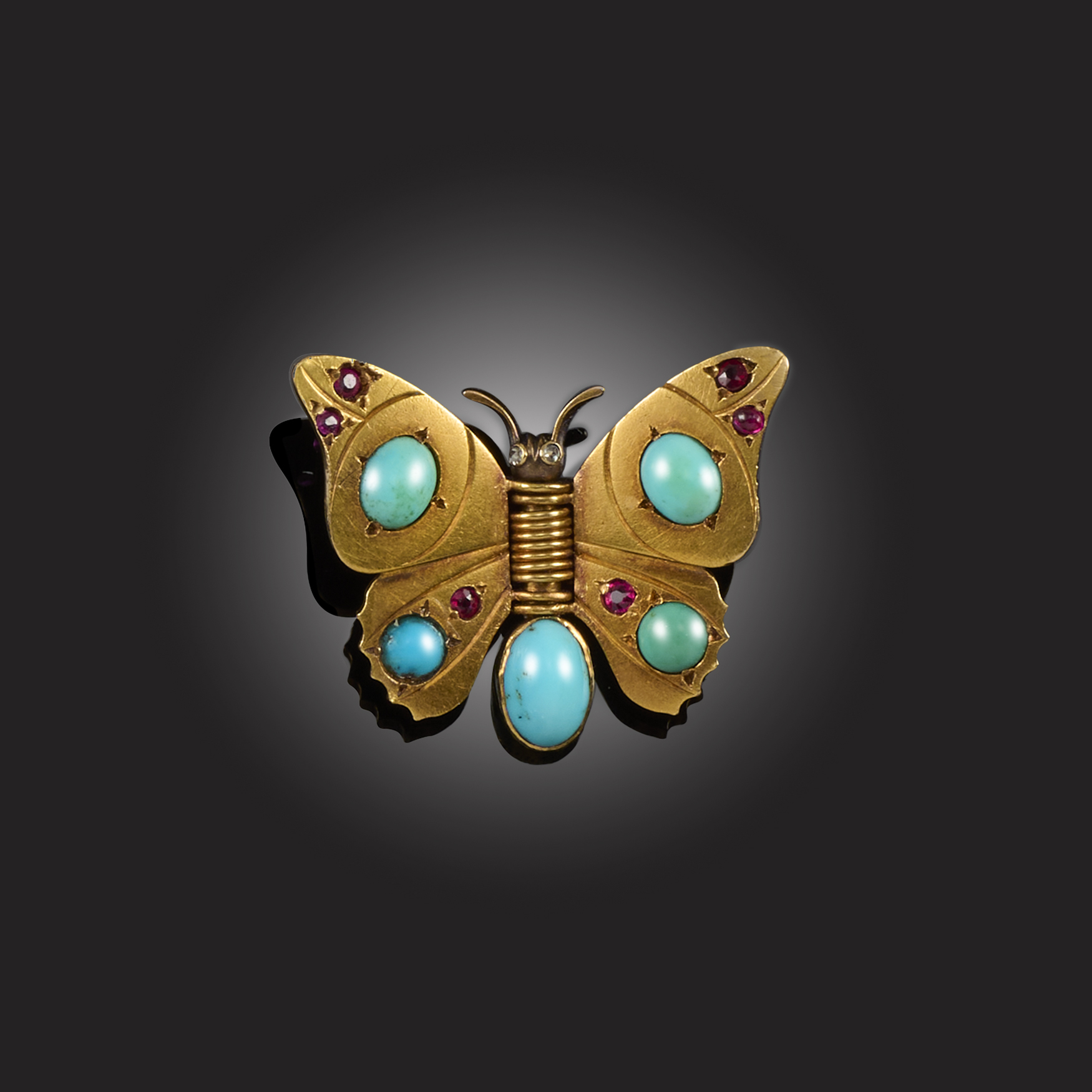 RENÉ BOIVIN, A GEM-SET GOLD BROOCH, 1957, designed as a butterfly, set with turquoise cabochons and circular-cut rubies, the head with diamond-set eyes, French control marks and maker's mark, width 3.3cm, gross weight 10g, case