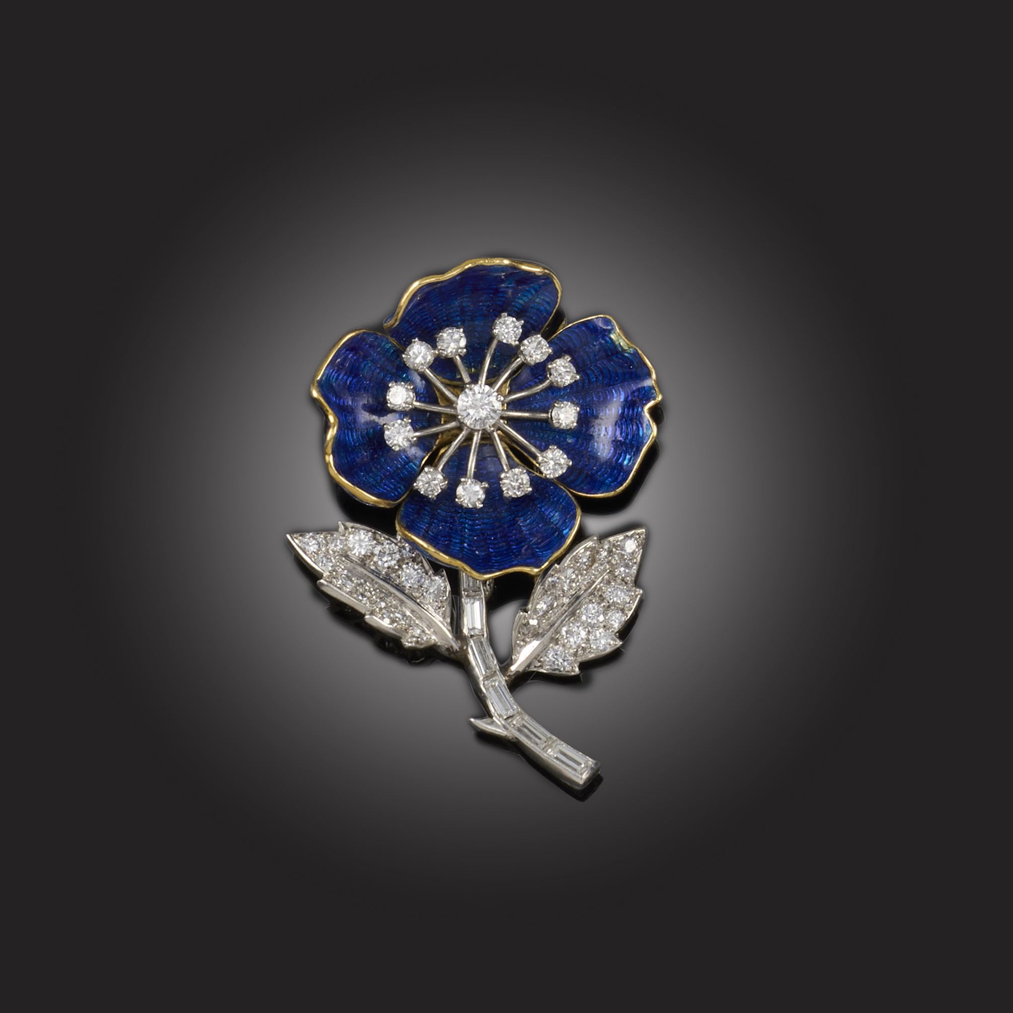 BOUCHERON, A DIAMOND AND ENAMEL BROOCH, 1950s, designed as a flower, decorated with blue guilloché enamel petals in yellow gold, centred with white gold pistils each set with a round brilliant-cut diamond, all to a white gold stem set with baguette-shaped diamonds issuing leaves pavé-set with graduated round brilliant-cut diamonds, signed Boucheron, French control marks, stamped 18 750, length 4.3cm, gross weight 16g, small chip to one petal, later box