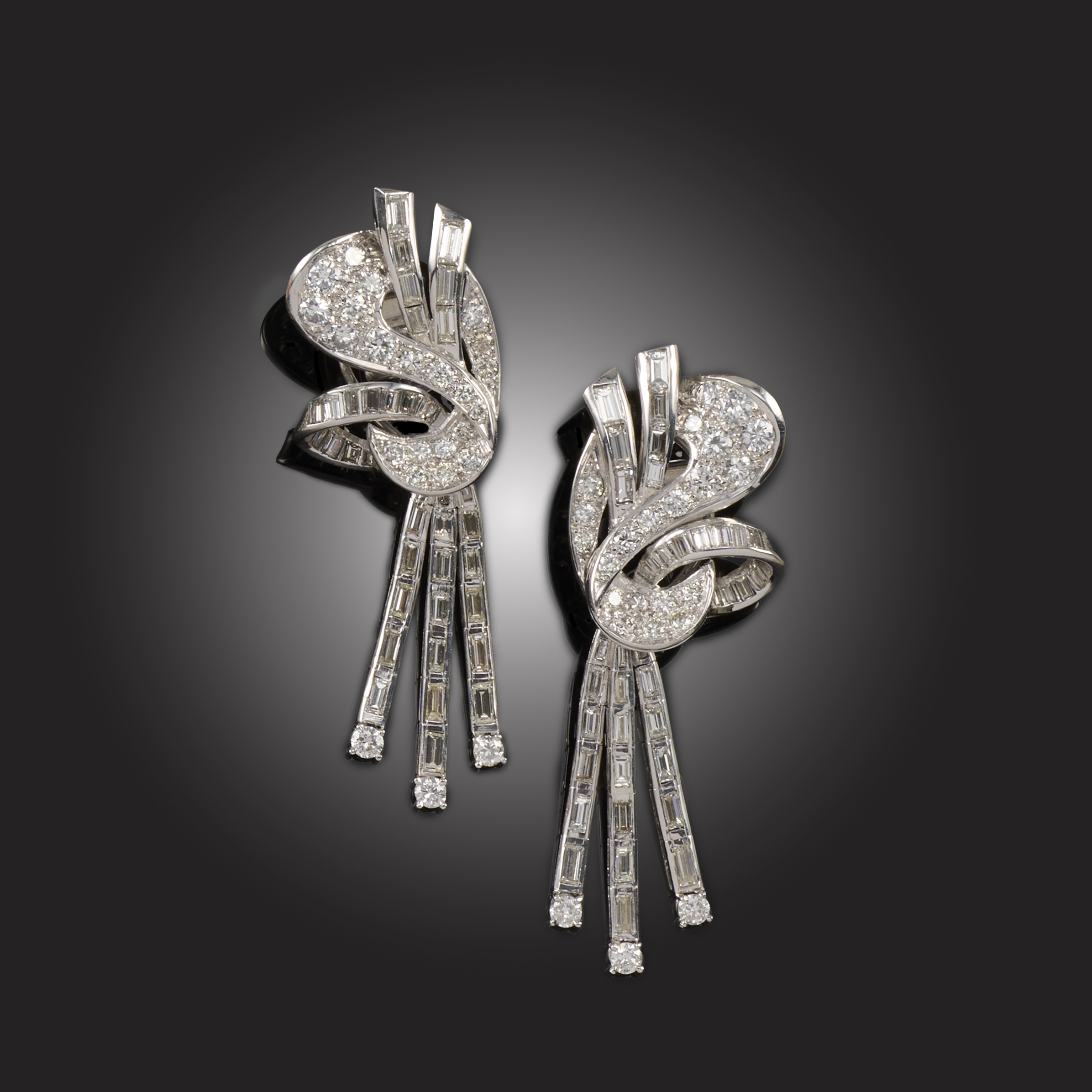 A PAIR OF DIAMOND 'DAY & NIGHT' EARRINGS, MID 20TH CENTURY, with pierced scrolling surmounts suspending detachable articulated tassel drops, set with round brilliant-cut and baguette-shaped diamonds, mounted in platinum, post fittings, length 5.5cm