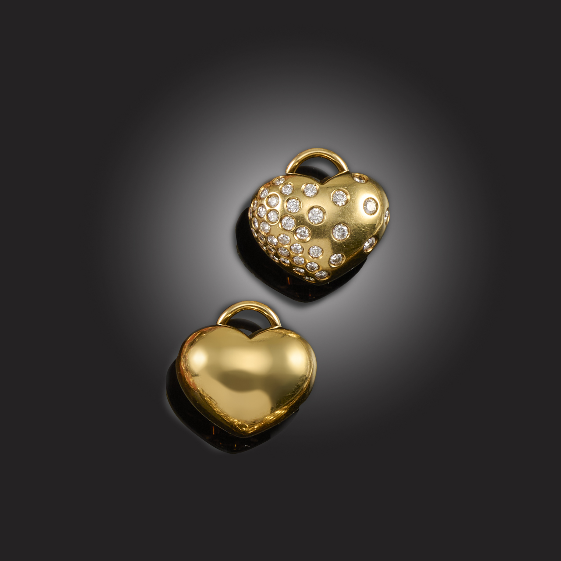 MAPPIN & WEBB, A PAIR OF DIAMOND AND 18CT GOLD EARRINGS, of puffy heart-shaped design, one earring set with graduated round brilliant-cut diamonds, maker's mark M&W, London import marks, clip and post fittings, width 1.8cm, gross weight 14g, case stamped Mappin & Webb