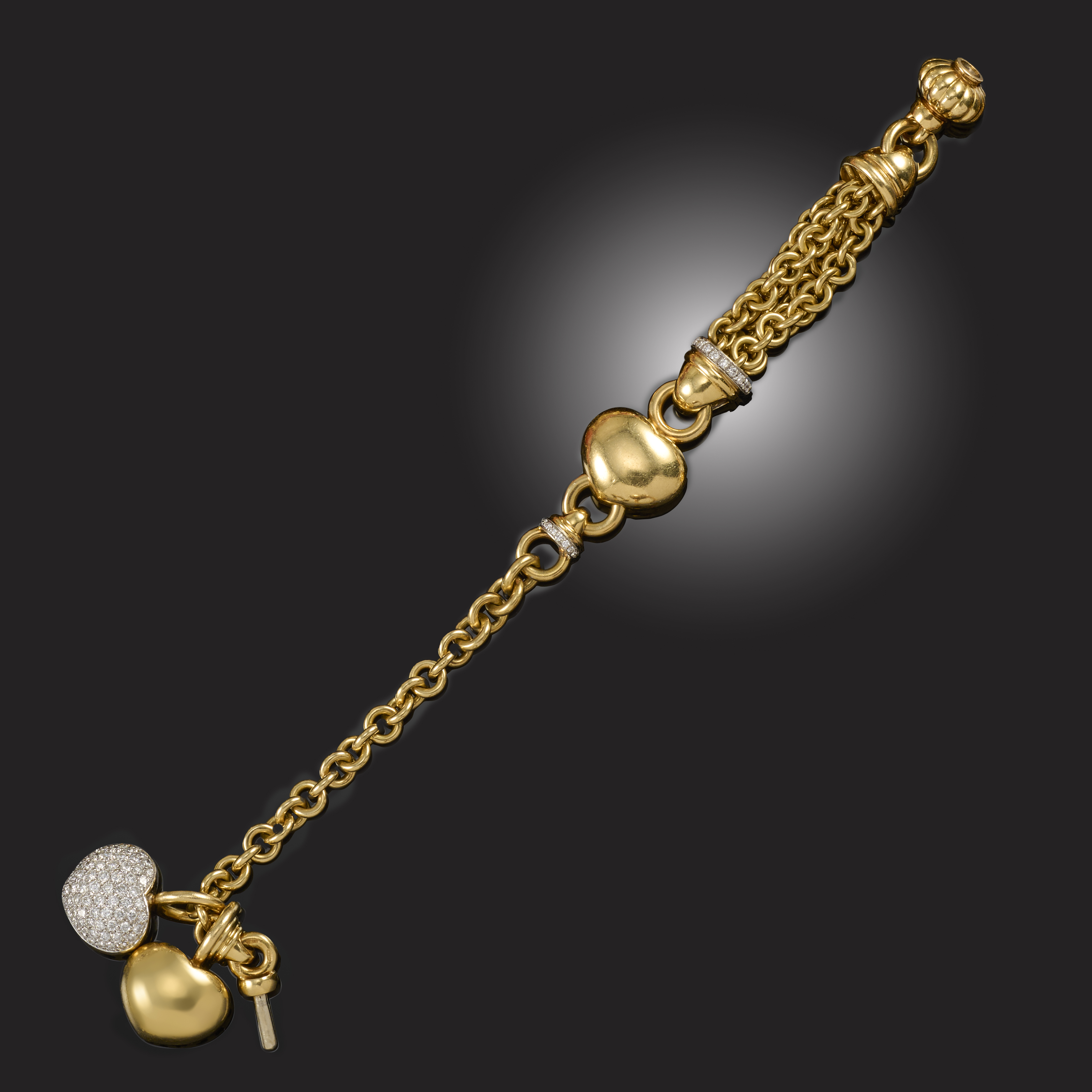 KUTCHINSKY, A DIAMOND AND 18CT GOLD BRACELET, CIRCA 1991, of assymetric design, of circular linking suspending a heart-shaped pendant pavé-set with round brilliant-cut diamonds and another plain heart-shaped pendant, the other half a cluster of four circular-link strands between a diamond-set terminal and a plain terminal, the two halves conjoined by a large heart-shaped link, maker's mark for Kutchinsky, London import marks for 1991, Italian control marks, length 18cm, gross weight 54g