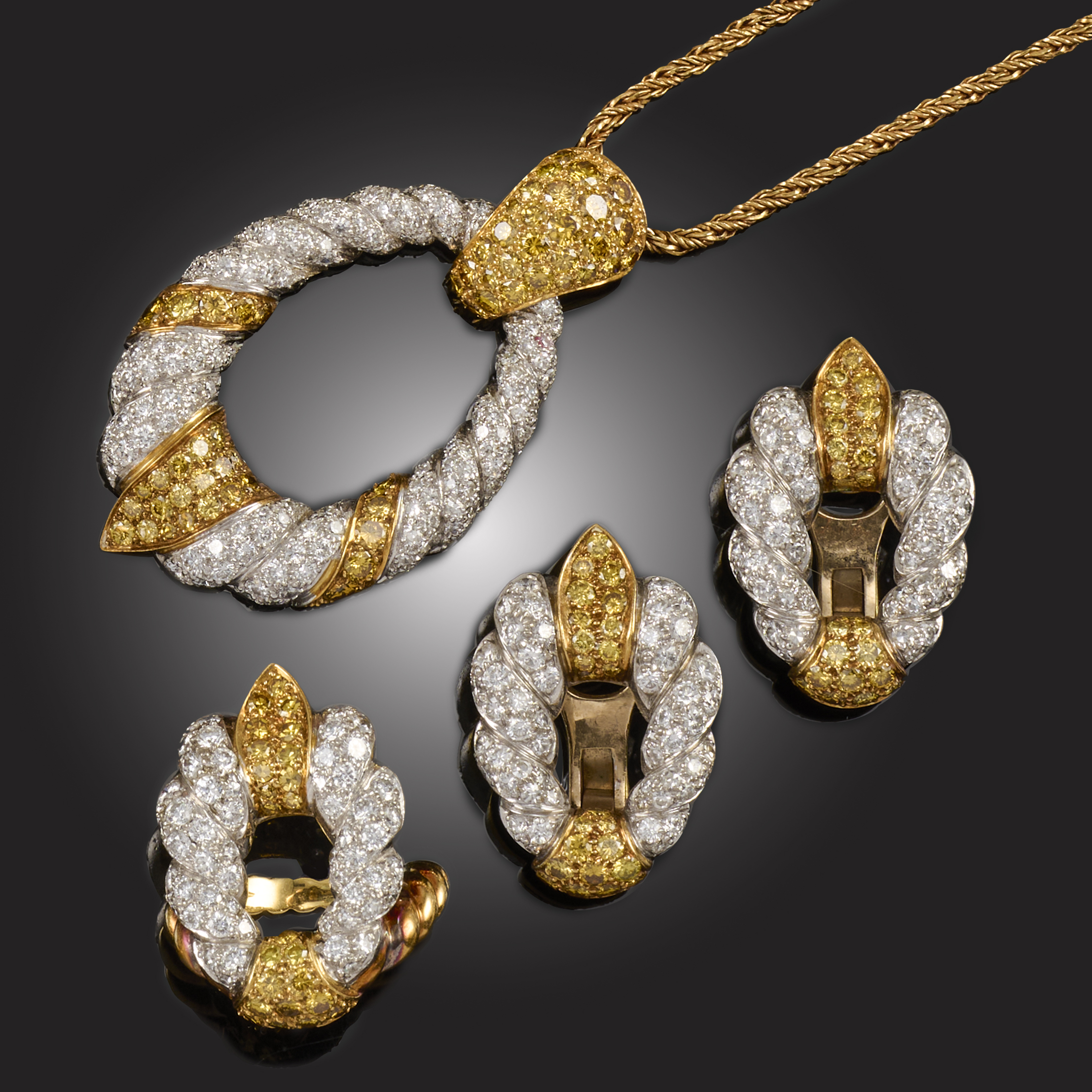 KUTCHINSKY, A YELLOW AND WHITE DIAMOND DEMI PARURE, CIRCA 1969, comprising a pendant of door knocker design pavé-set with round brilliant-cut diamonds suspending a fluted wreath alternately-set with colourless and white diamonds in platinum and gold, on a later ropetwist chain, pendant length 5.4cm, chain length 41cm, with maker's plaque, with a matching pair of earrings, with maker's plaque and London hallmarks for 18ct gold, length 3cm, clips fittings; and a matching ring, maker's plaque and partially obscured hallmarks for 1969, size L