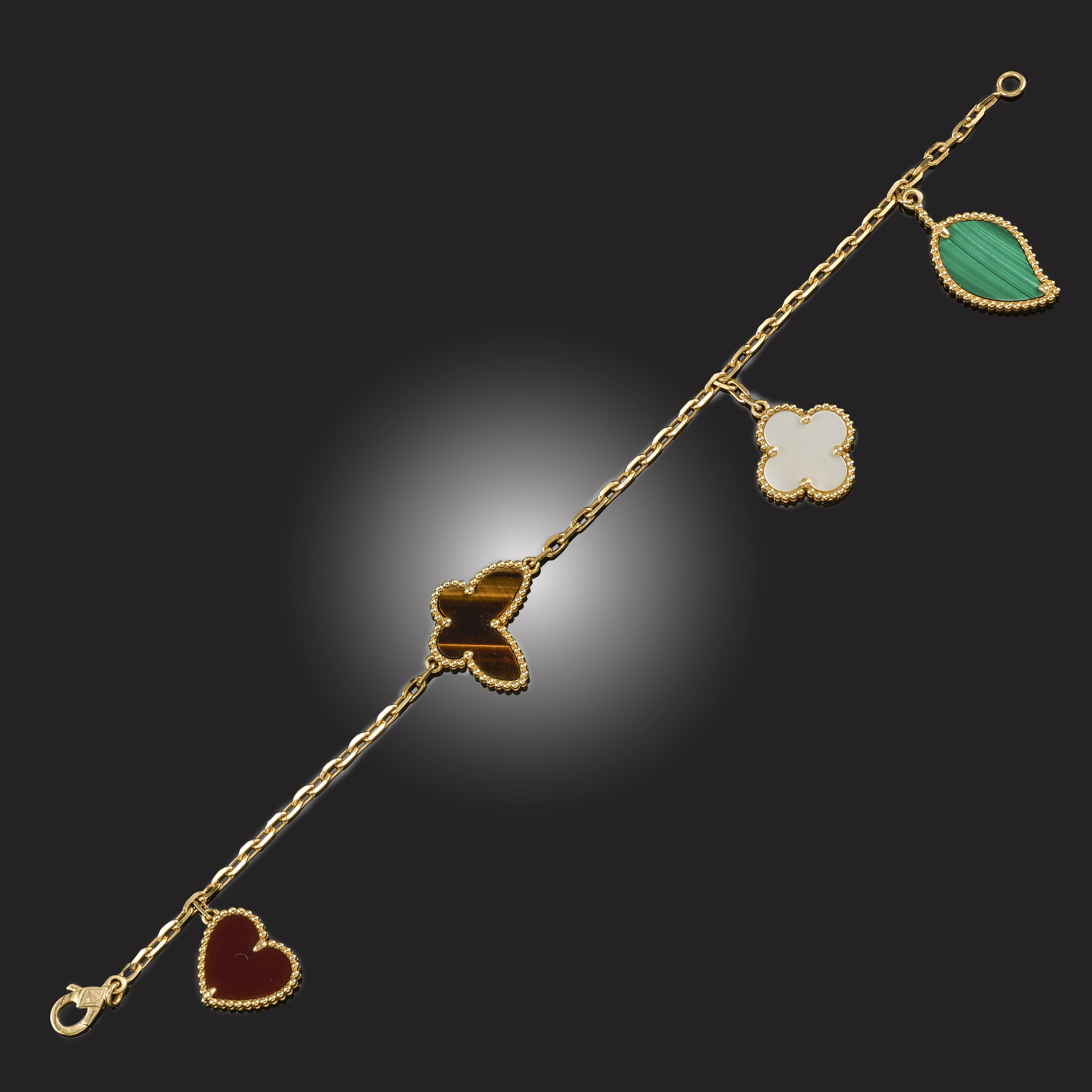 VAN CLEEF & ARPELS, A GEM-SET 'LUCKY ALHAMBRA' BRACELET, the gold bracelet suspending four charms including a malachite leaf, a carnelian heart, a mother-of-pearl clover and a tiger's eye butterfly, each within a beaded gold border, with a maker's mark, stamped Au750, numbered JE325880, length 18cm, cased