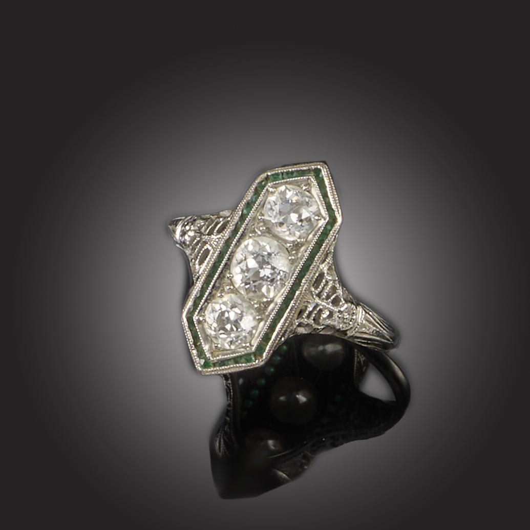 A LATE ART DECO THREE-STONE DIAMOND RING, set with three circular-cut diamonds within an elongated hexagonal emerald border, in a pierced and engraved foliate decorated mount, in white gold, stamped 18kt, size Q 1/2