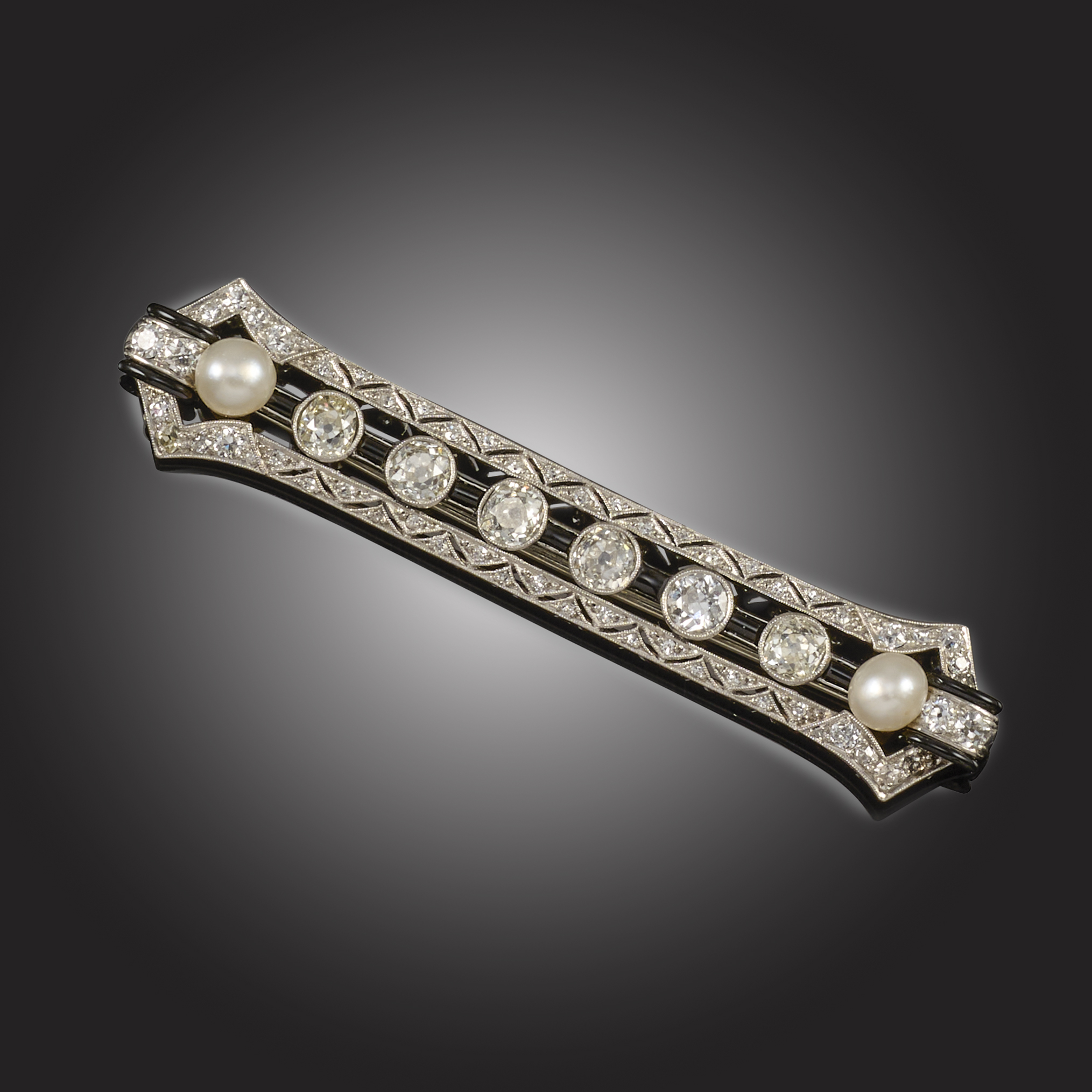 AN ART DECO NATURAL PEARL AND DIAMOND BROOCH, 1920s, of geometric bar design, centring on a line of collet-set circular-cut diamonds, accented with black lacquer and bordered with smaller circular-cut diamonds, each end set with a natural pearl, mounted in white gold, length 7.3cm
