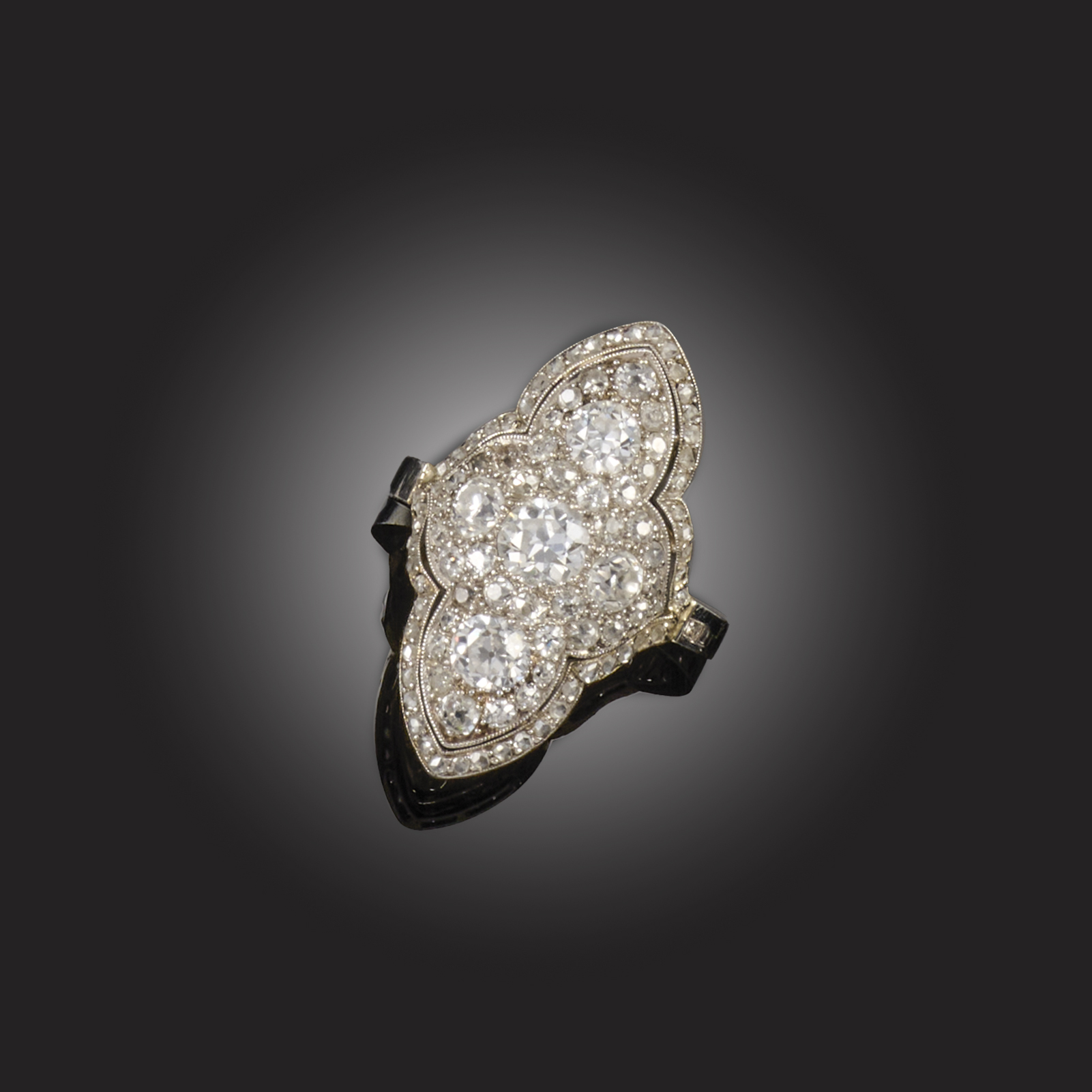 AN ART DECO DIAMOND CLUSTER RING, of quatrefoil design set with graduated old circular-cut diamonds in pierced platinum mount, later shank, size Q
