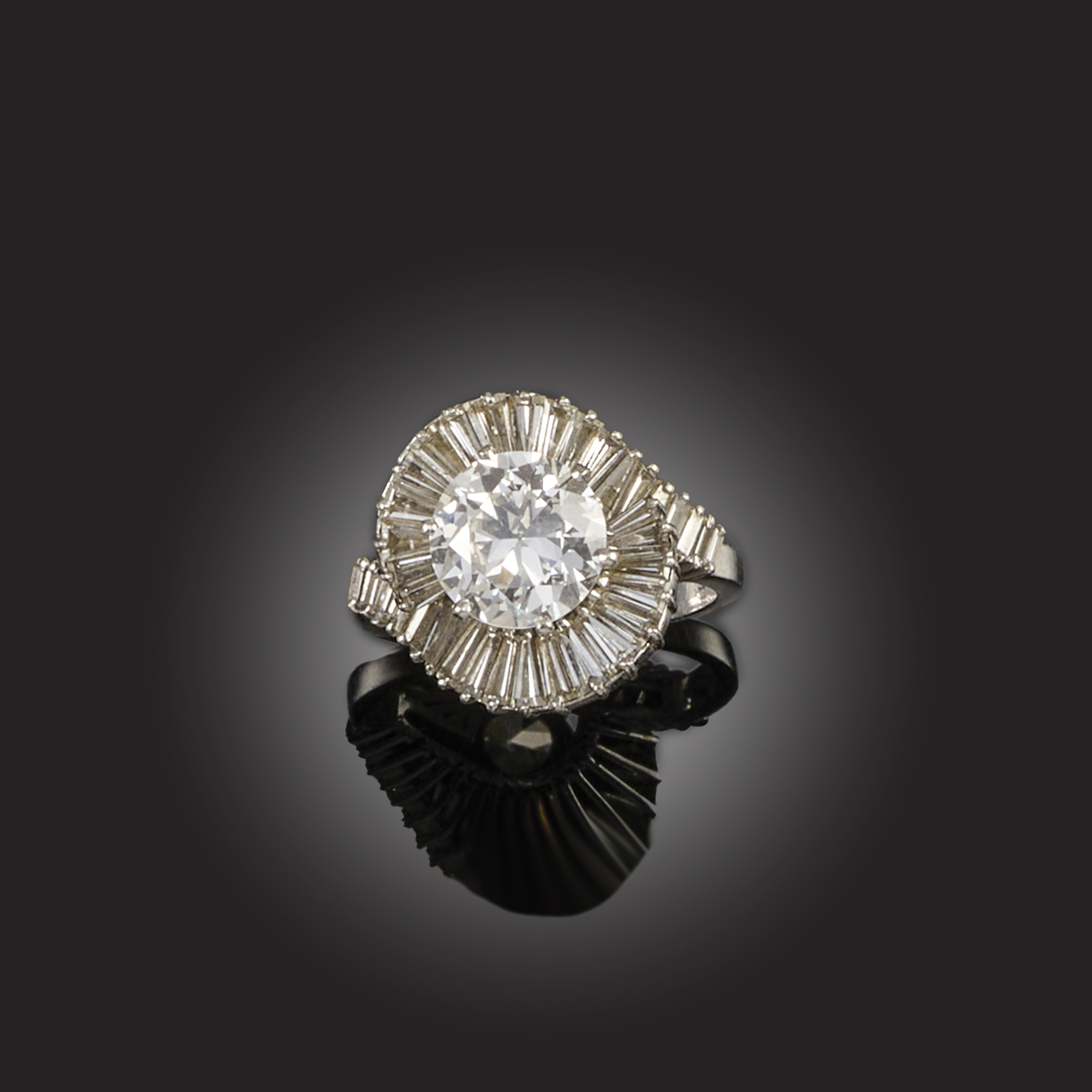 A DIAMOND CLUSTER RING, set with a round brilliant-cut diamond to the centre weighing approximately 2.25cts, within a graduated scrolling border of tapering baguette-cut diamonds, size L