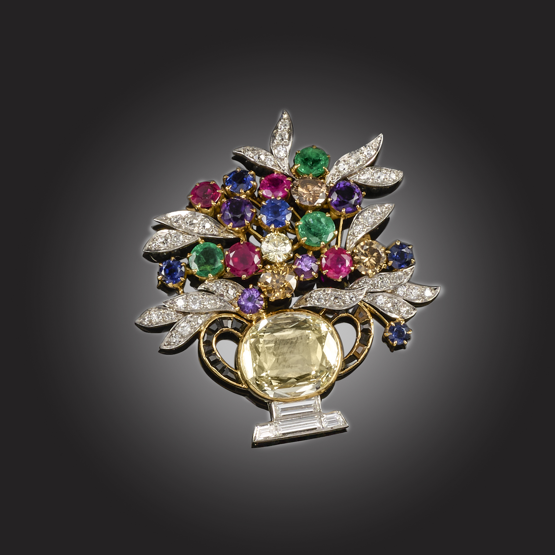 A GEM-SET GIARDINETTO BROOCH, 1960'S, set with a diamond of yellow tint weighing approximately 4.70cts to the vase motif with onyx-set handles and white diamonds to the foot, issuing a stylised floral spray set with circular-cut sapphires, emeralds, rubies and amethysts and round brilliant-cut yellow and brown diamonds amidst white diamond-set foliage, mounted in gold and platinum, width 4cm