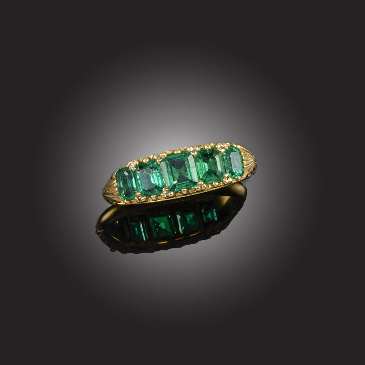AN EMERALD FIVE-STONE RING, 1987, set with a row of graduated emerald-cut emeralds in a carved scrolling 18ct yellow gold setting, London hallmarks for 1987, size R