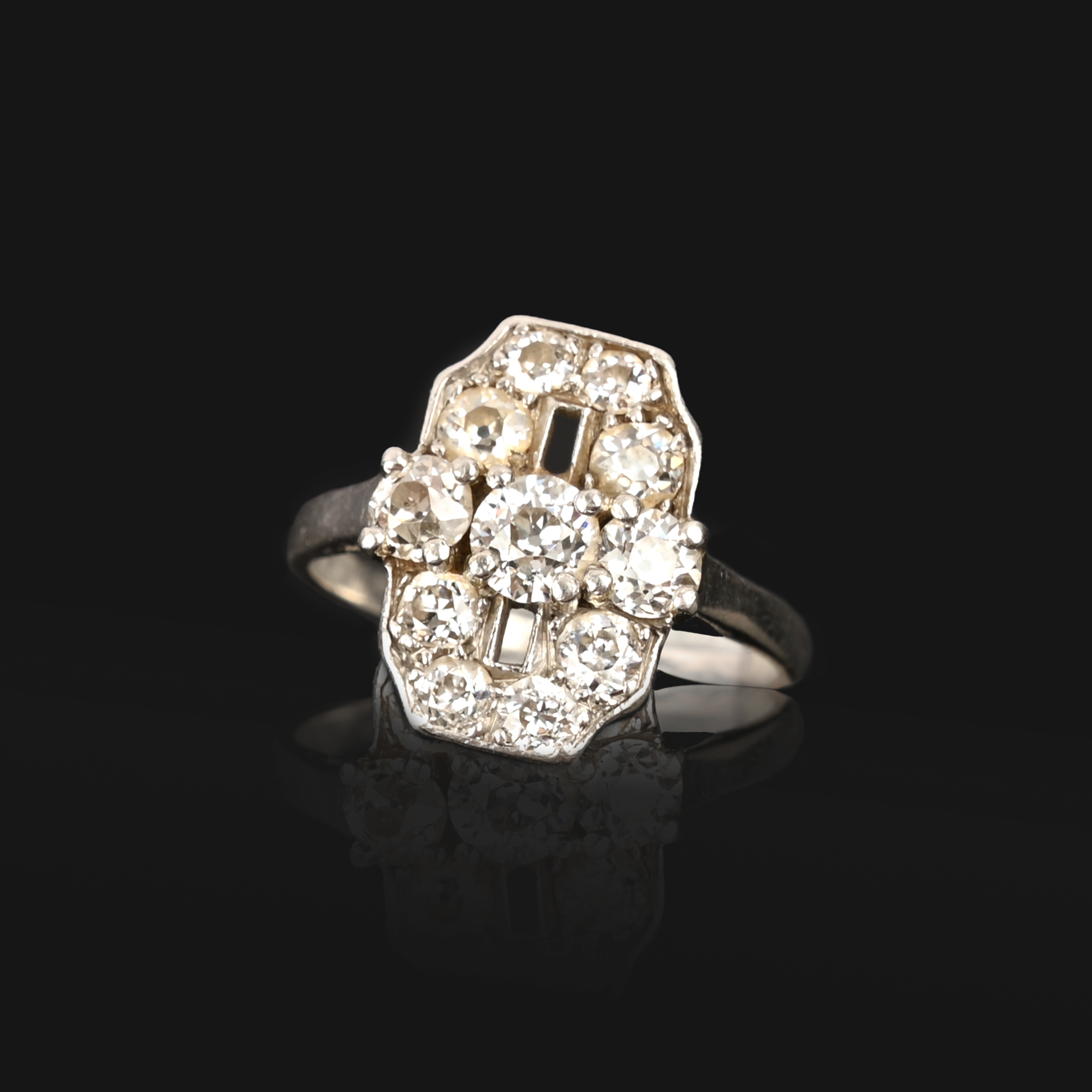 AN ART DECO DIAMOND CLUSTER RING, set with graduated old circular-cut diamonds in platinum, size J