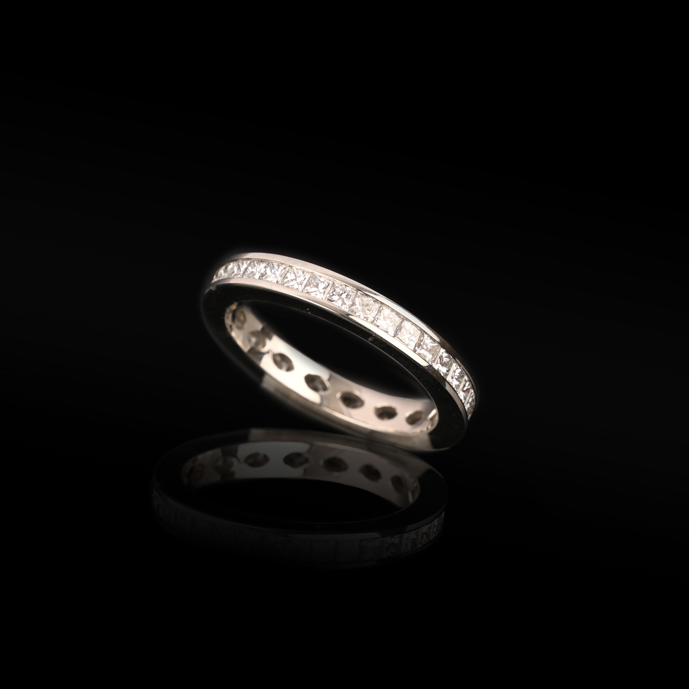 A DIAMOND ETERNITY RING, composed of a continuous row of princess-cut diamonds, channel set in platinum, London hallmarks for 2015, size N