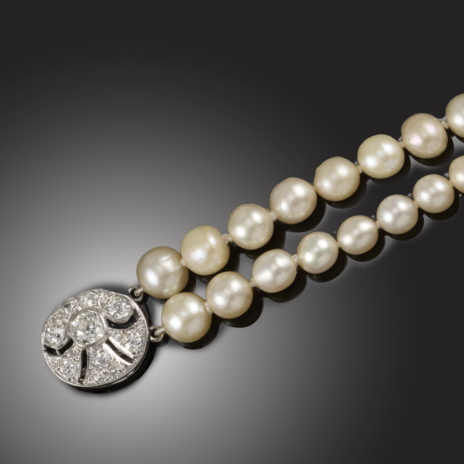 A PEARL AND DIAMOND NECKLACE, composed of two rows of graduated pearls measuring 4.7-7.6mm, to a white gold clasp set with cushion-shaped diamonds, one pearl cultured, length 35cm