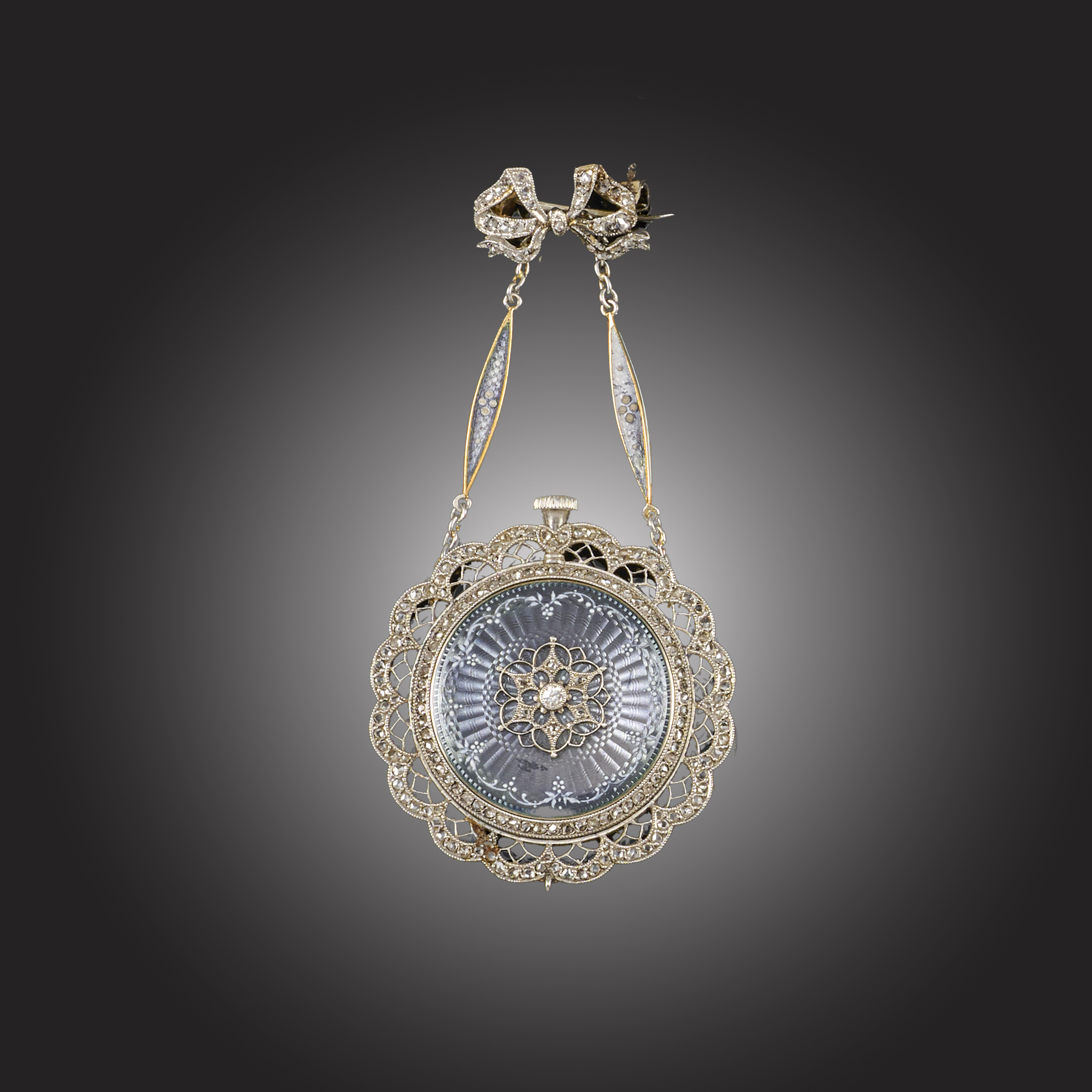 AN EDWARDIAN DIAMOND AND ENAMEL FOB WATCH, the silvered dial with black Arabic numerals, blued steel hands and subsidiary seconds dial at 6 o'clock, the reverse decorated with lavender grey guilloche enamel centred with a diamond-set motif and surrounded by a pierced lacy border millegrain-set with rose-cut diamonds, the watch suspended from two guilloche enamel plaques and a diamond-set brooch of ribbon-tie design, manual winding, numbered 19789, watch width 3.2cm, overall length 6.8cm, case