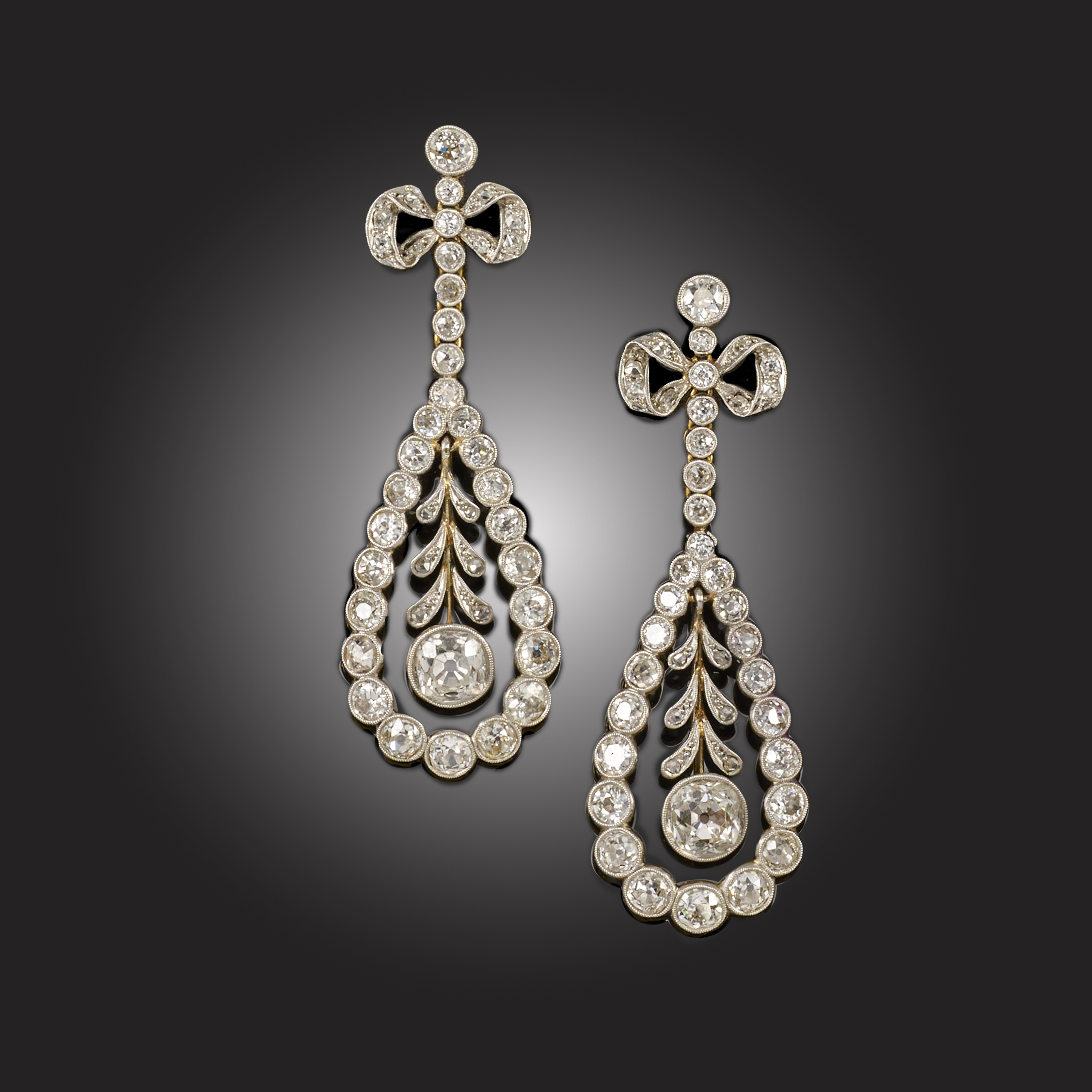 A PAIR OF DIAMOND DROP EARRINGS, the diamond-set bows suspend an articulated line of graduated old-cut diamonds terminating in a diamond loop suspending a larger old circular-cut diamond from foliate links within, set in platinum and gold, post fitting, length 5.5cm