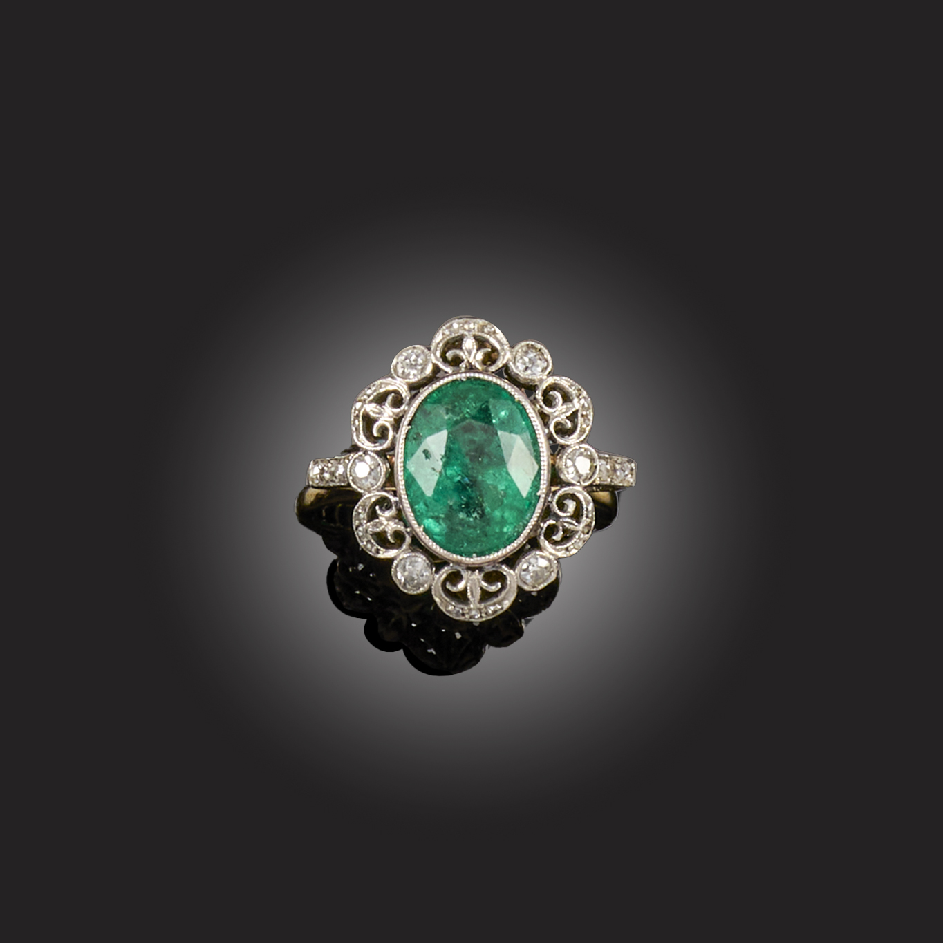 AN EMERALD AND DIAMOND CLUSTER RING, the oval-shaped emerald millegrain-set within scroll surround set with diamonds, with further diamond shoulders in platinum and gold, size K 1/2