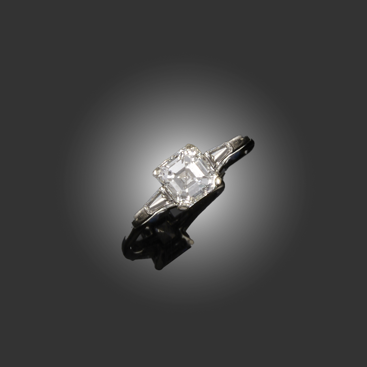 A DIAMOND SOLITAIRE RING, set with an asscher-cut diamond weighing 2.01cts, between shoulders each set with a tapering baguette-shaped diamond, mounted in platinum, size M, case