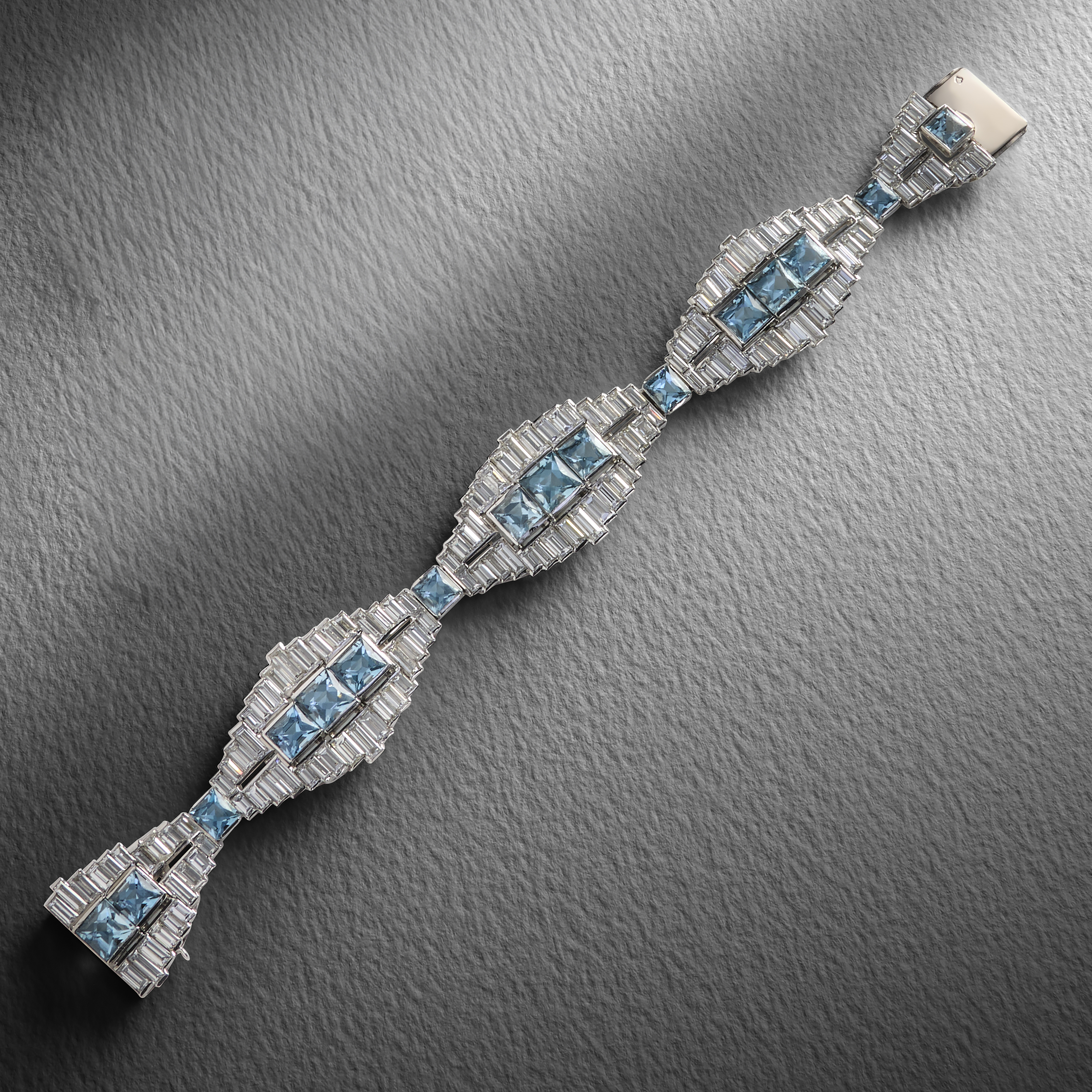 A FRENCH, LATE ART DECO AQUAMARINE AND DIAMOND BRACELET, of geometric design, the four tapering panels centred with three French-cut aquamarines within stepped borders of baguette-shaped diamonds, separated with single French-cut aquamarines, in platinum, French control mark, length 17.5cm