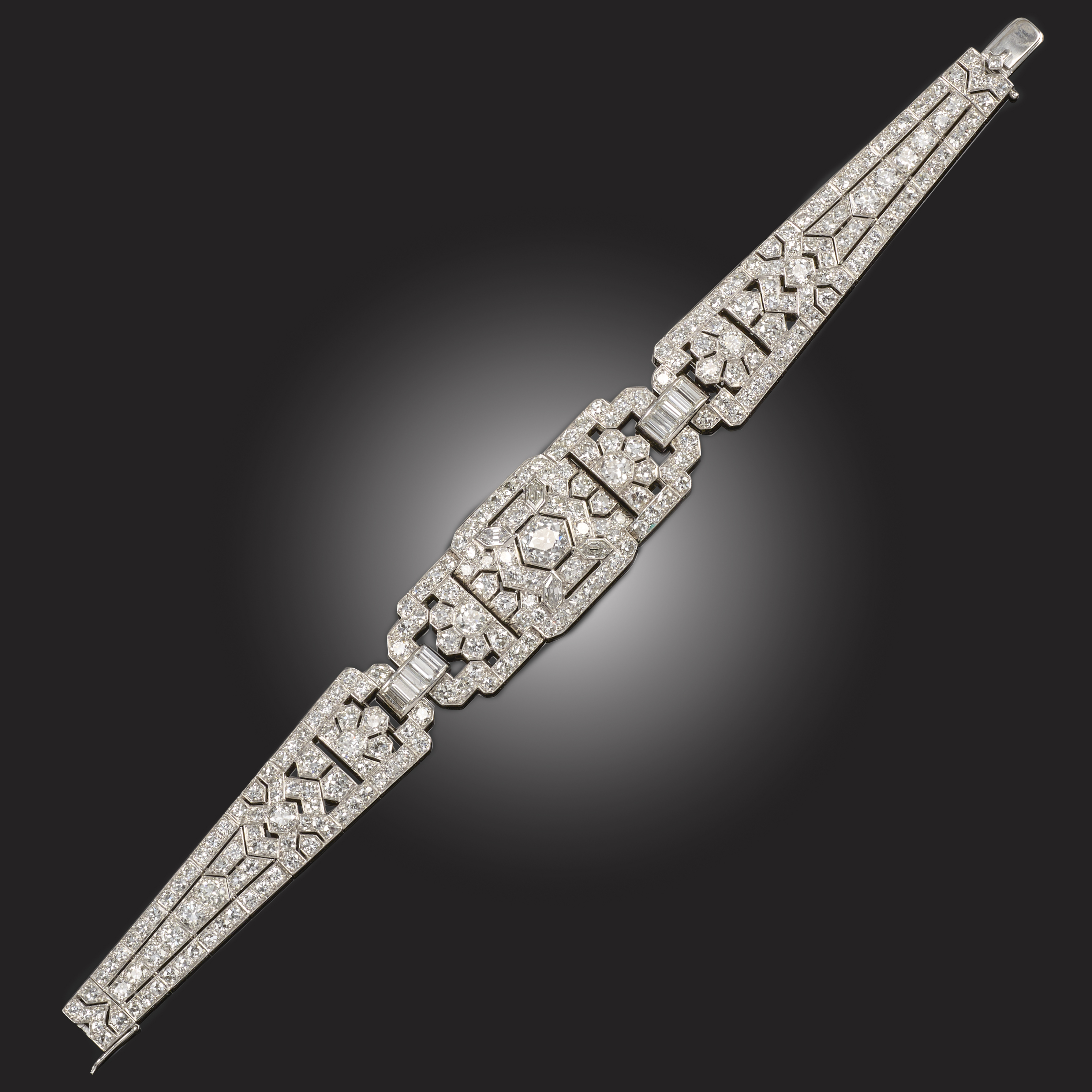 AN ART DECO DIAMOND BRACELET, of geometric design, set with old circular-, baguette- and marquise-shaped diamonds to a tapering bracelet, in platinum, length 18cm, Asprey case