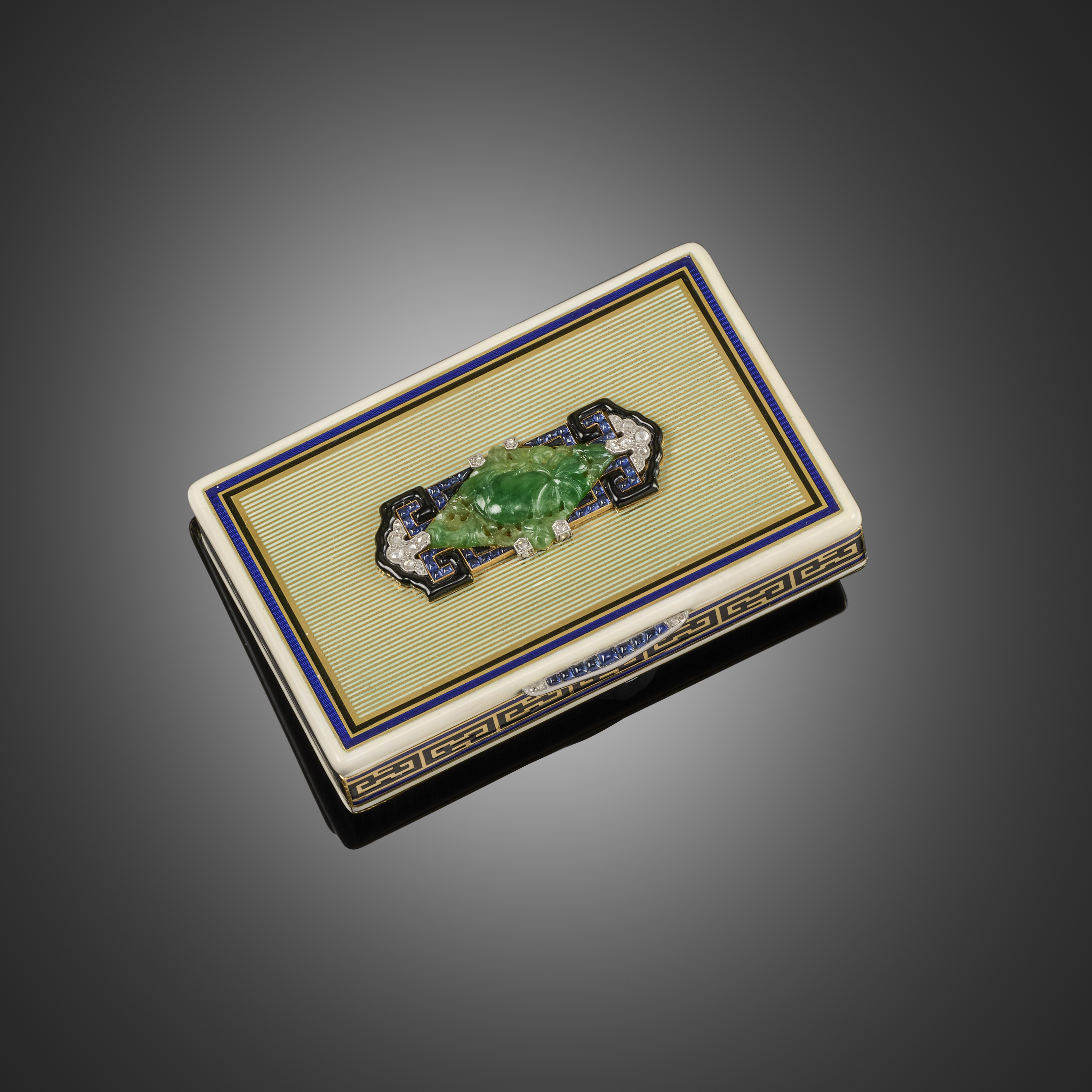 CARTIER, AN ART DECO JADEITE, SAPPHIRE, DIAMOND AND ENAMEL VANITY CASE, PARIS, CIRCA 1925, of rectangular form, decorated with white enamel and a border of geometric chinoiserie motifs in black and blue basse-taille enamel, the hinged cover set with a carved green jadeite foliate plaque decorated with mounts set with sugarloaf cabochon sapphires and rose-cut diamonds, with a sapphire- and diamond-set thumbpiece, opening to reveal a covered compartment inscribed '34 East 36th Street, New York' and '12 Grosvenor Sq., W.1', a hinged lipstick holder and a mirror to the cover, lipstick holder bearing the monogram 'C.A.M.' in yellow gold, signed Cartier, Paris Londres New York, French 'tête de lièvre' mark, width 8.8cm, gross weight 173g