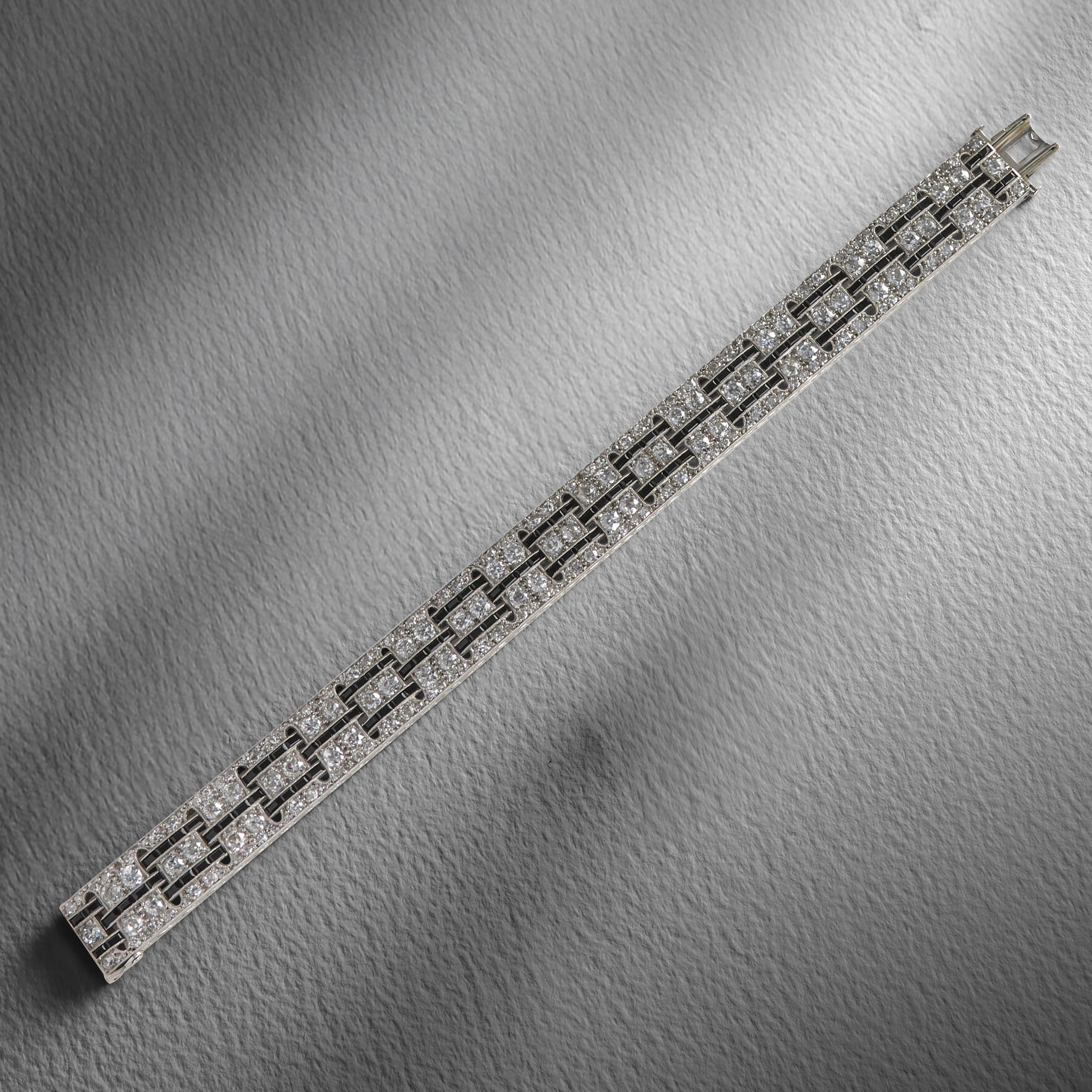 LOUIS MARUZZI, AN ART DECO DIAMOND AND ONYX BRACELET, CIRCA 1925, composed of pierced links pavé-set with old circular-cut and single-cut diamonds with baguette-shaped onyx in milligrain settings, forming a trompe-l'oeil woven pattern, in platinum, French control marks and maker's mark, length 17.5cm