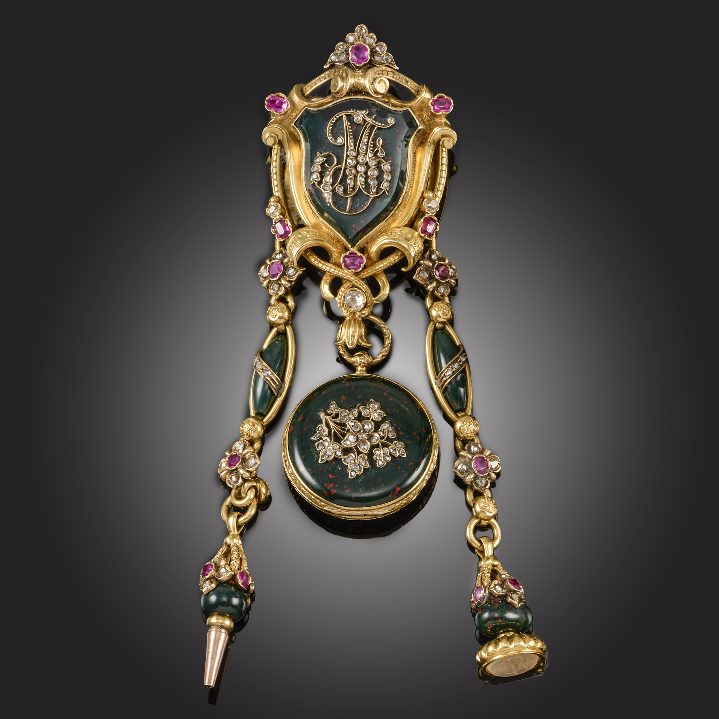 A 19TH CENTURY BLOODSTONE, RUBY AND DIAMOND CHATELAINE, composed of a belt hook centred with a bloodstone medallion with a diamond-set cipher, within a pierced scrolling frame set with rubies and diamonds, suspending a key-wind fob watch with a bloodstone back decorated with a diamond-set floral spray, between two elaborate drops suspending a watch key and an initialled fob seal, in yellow gold, total length 11cm, gross weight 54g, tongue detached