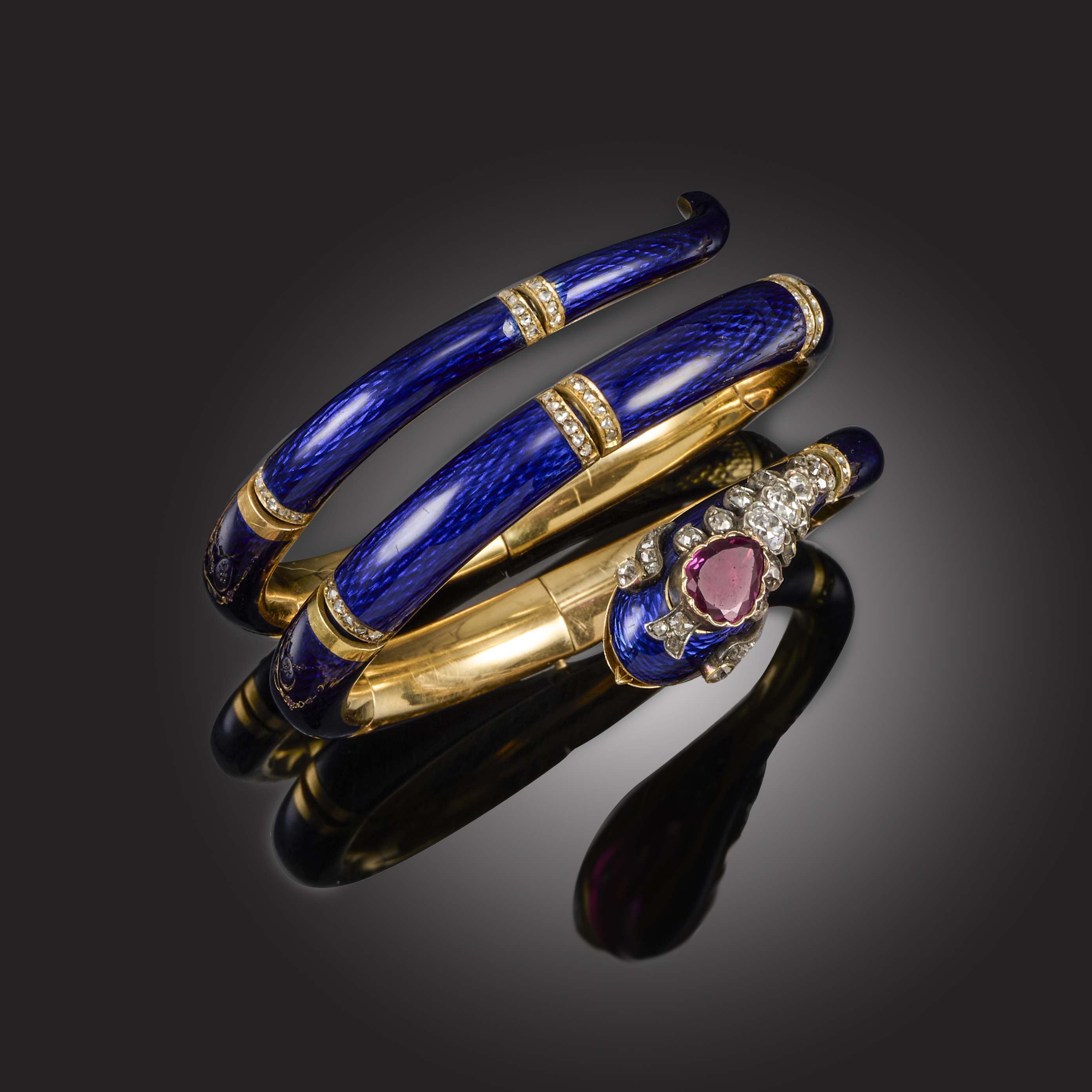 A VICTORIAN RUBY, DIAMOND AND ENAMEL BANGLE, CIRCA 1860, designed as a coiled snake, its head set with a pear-shaped ruby and cushion-shaped and rose-cut diamond, the articulated links decorated throughout with blue basse-taille enamel and diamond-set borders, in yellow gold, inner circumference approx. 17.5cm, gross weight 75g, enamel damaged