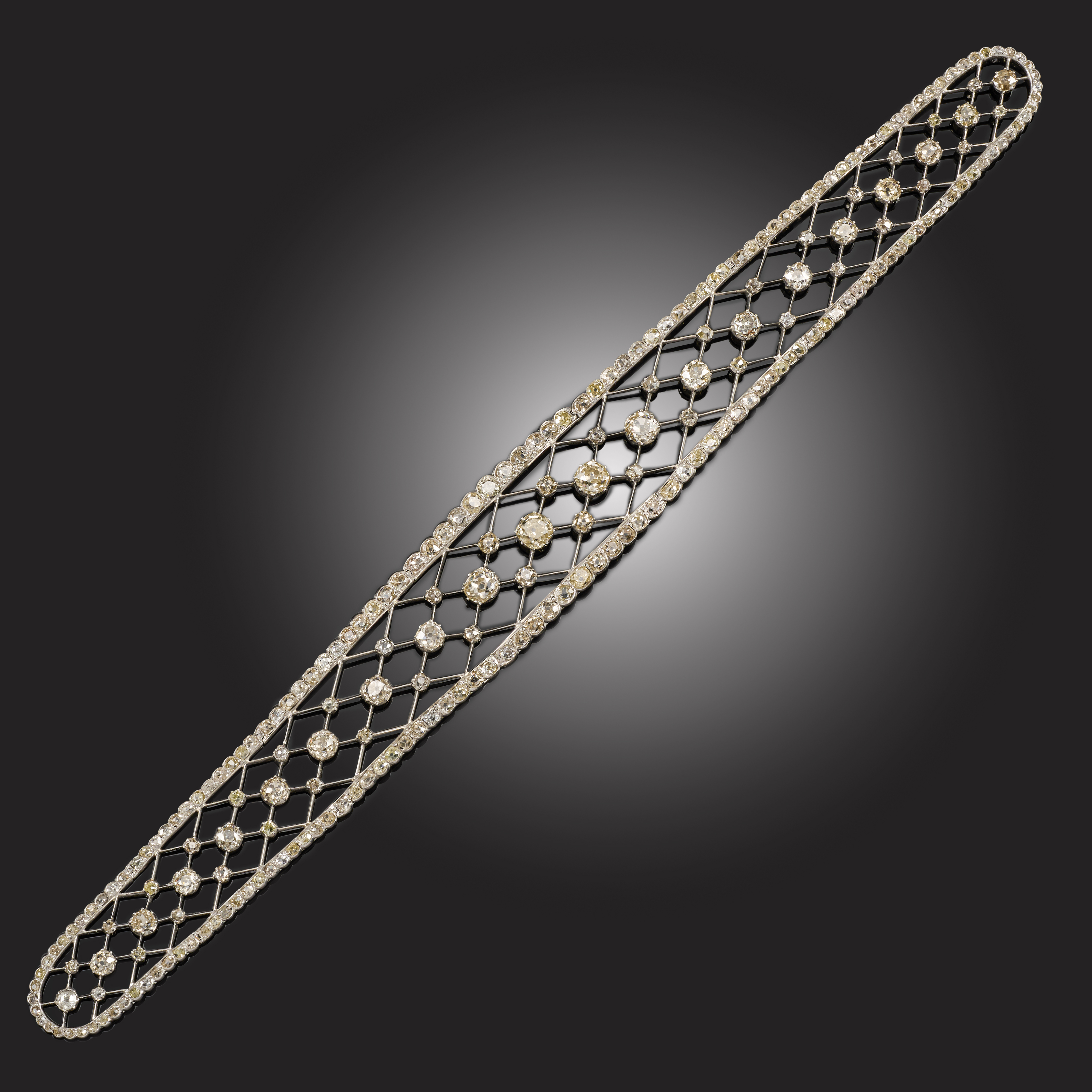 AN EARLY 20TH CENTURY DIAMOND BANDEAU, designed as an articulated tapering band decorated with an openwork trellis pattern set with graduated cushion-shaped diamonds, within a collet-set border of cushion-shaped diamonds, in platinum, length 23.5cm, lacking frame