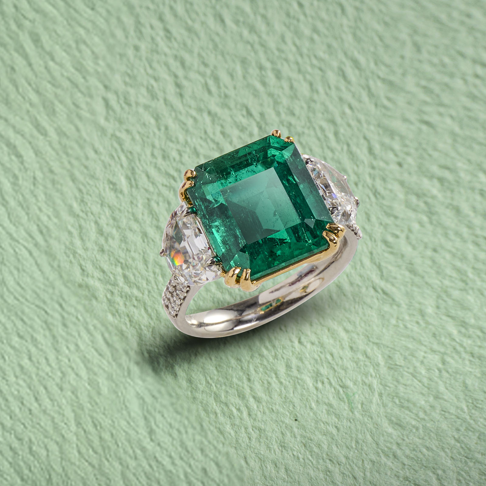 AN EMERALD AND DIAMOND THREE STONE RING, the emerald-cut emerald weighing 7.44cts, flanked with demi-lune-shaped diamonds and further diamonds to the shank in gold, size M