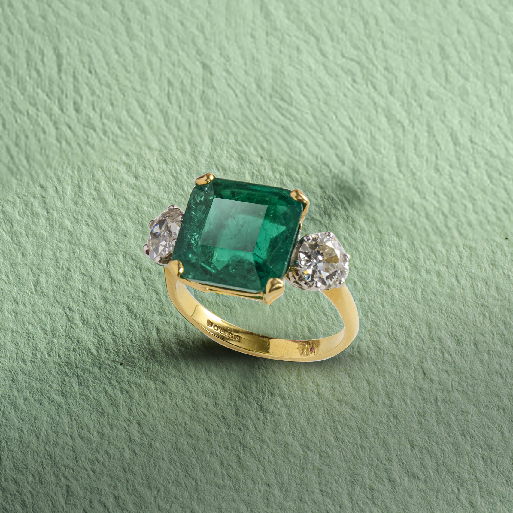 AN EMERALD AND DIAMOND RING, set with a square step-cut emerald to the centre weighing approximately 4.40cts, flanked by two old European-cut diamonds, in 18ct yellow gold, makers mark CLD, with London hallmarks for 1973, size L 1/2, case