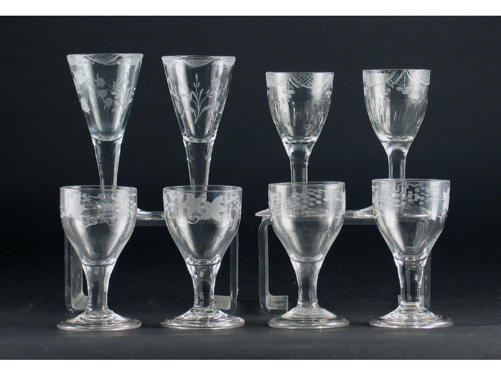 Eight various engraved glasses. The two moulded glasses with foot-rim chips. 12.5cm. Max. (8)