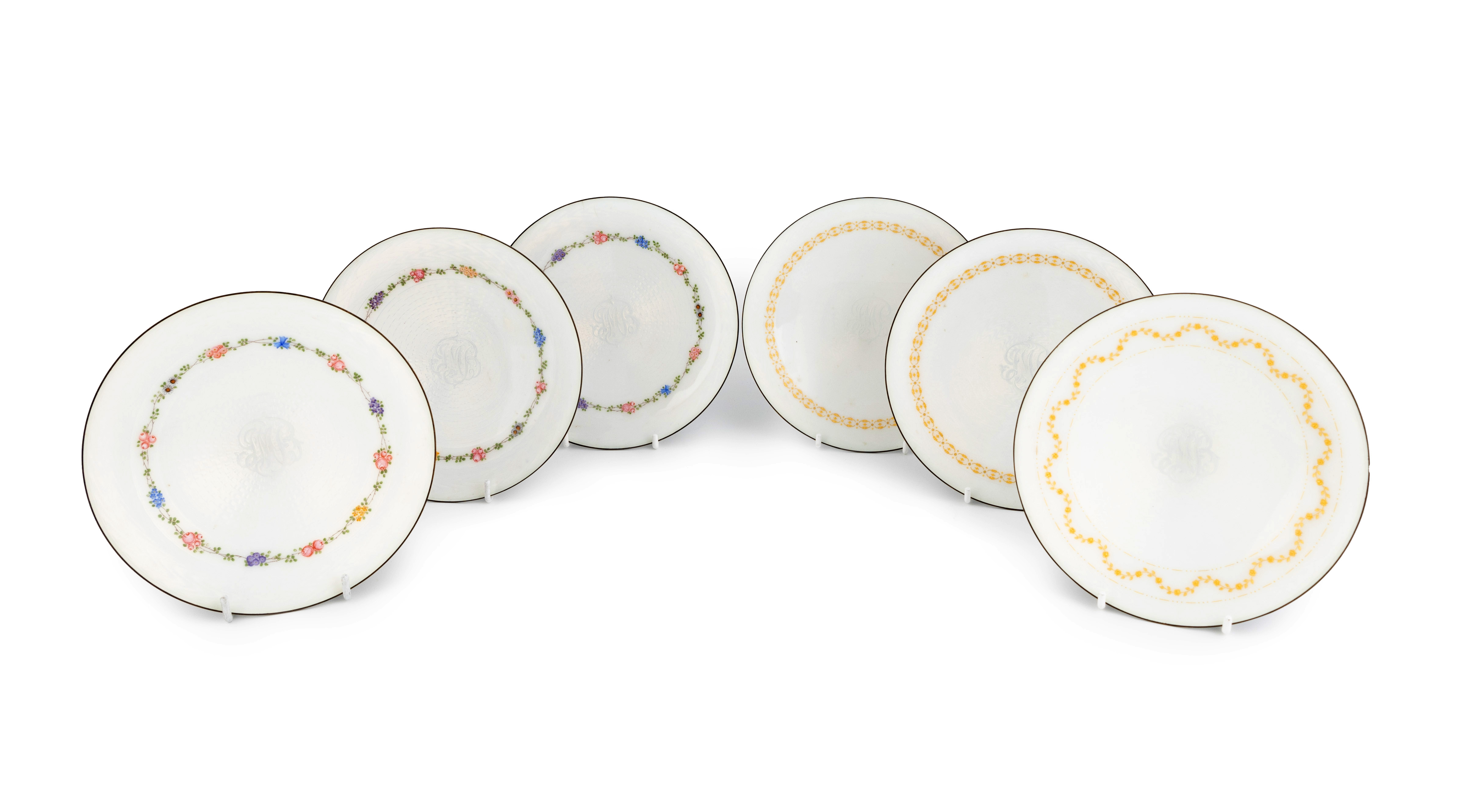 circular form, comprising: three with a border of flowers, on a basket-weave ground, the centre with a monogram, (two unmarked), plus three with a gilt border, on an engine-turned ground, the centres also with a monogram, diameters 16.2cm. (6)