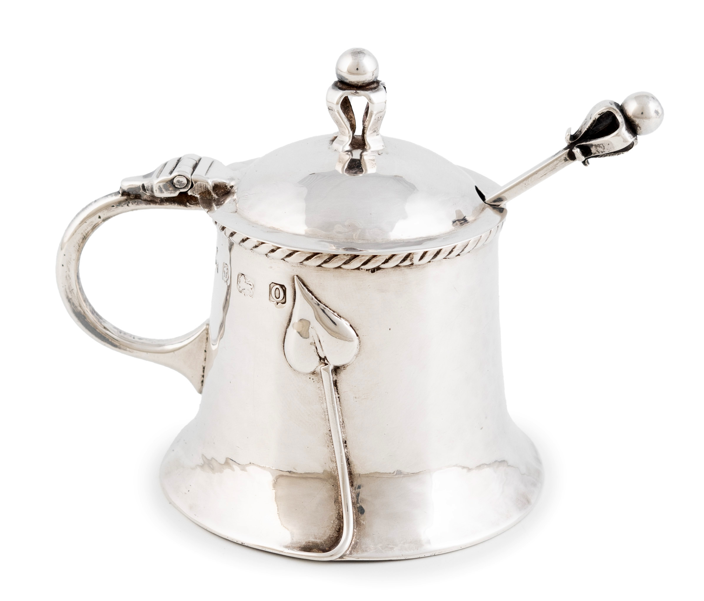 tapering circular form, spot-hammered decoration, applied foliate motifs, ropework border, the spoon with a ball finial, height 7cm, approx. weight 2.4oz. (2)
