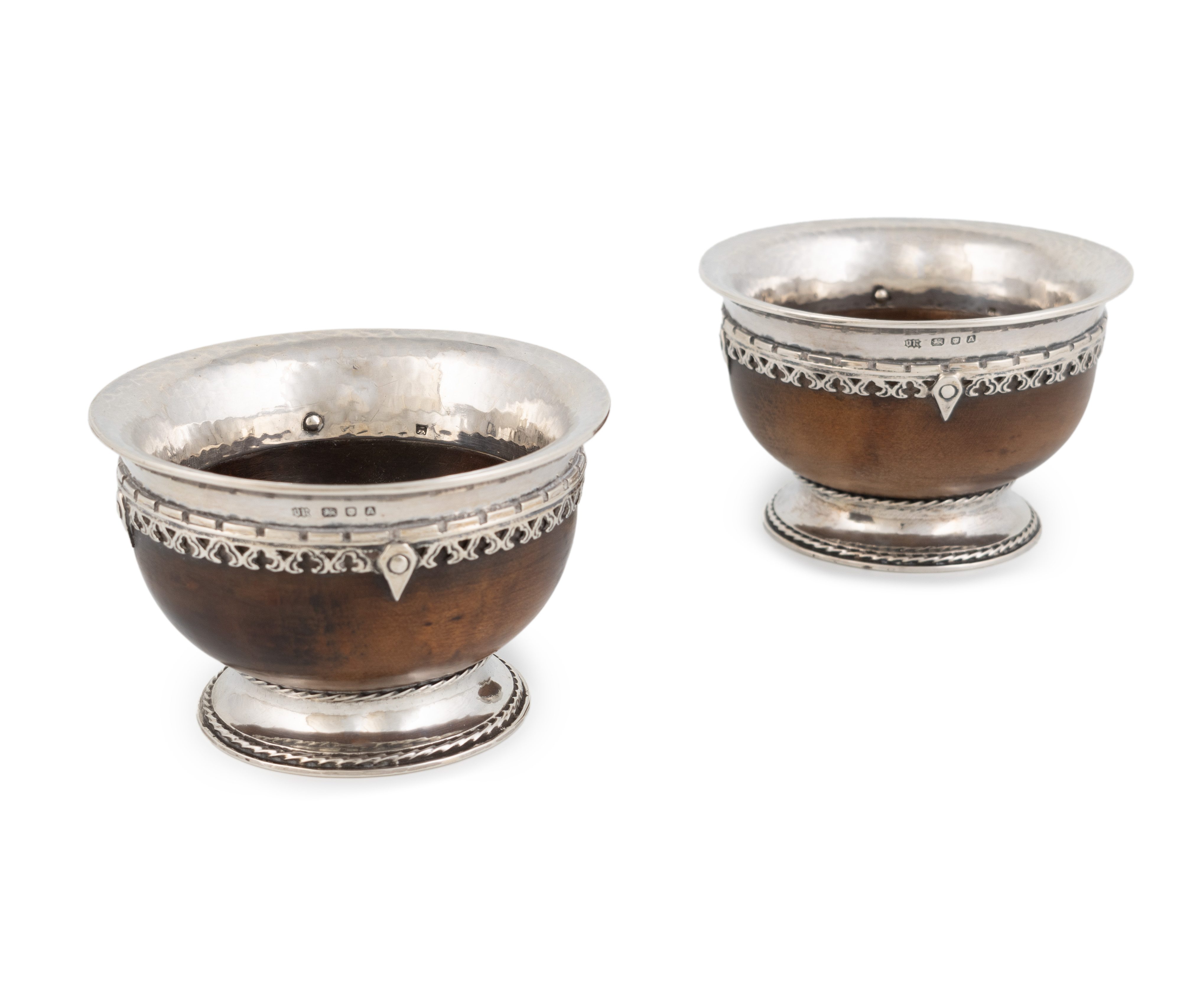 By Omar Ramsden, a pair of small Arts & Crafts silver-mounted mazer bowls,