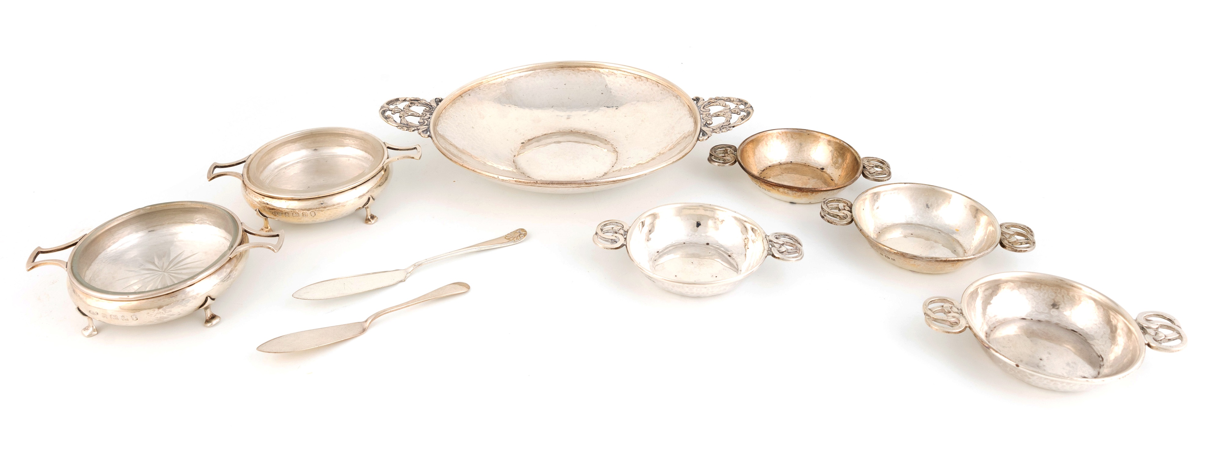 By A.E.Jones, a collection of Arts & Crafts silver two-handled dishes,